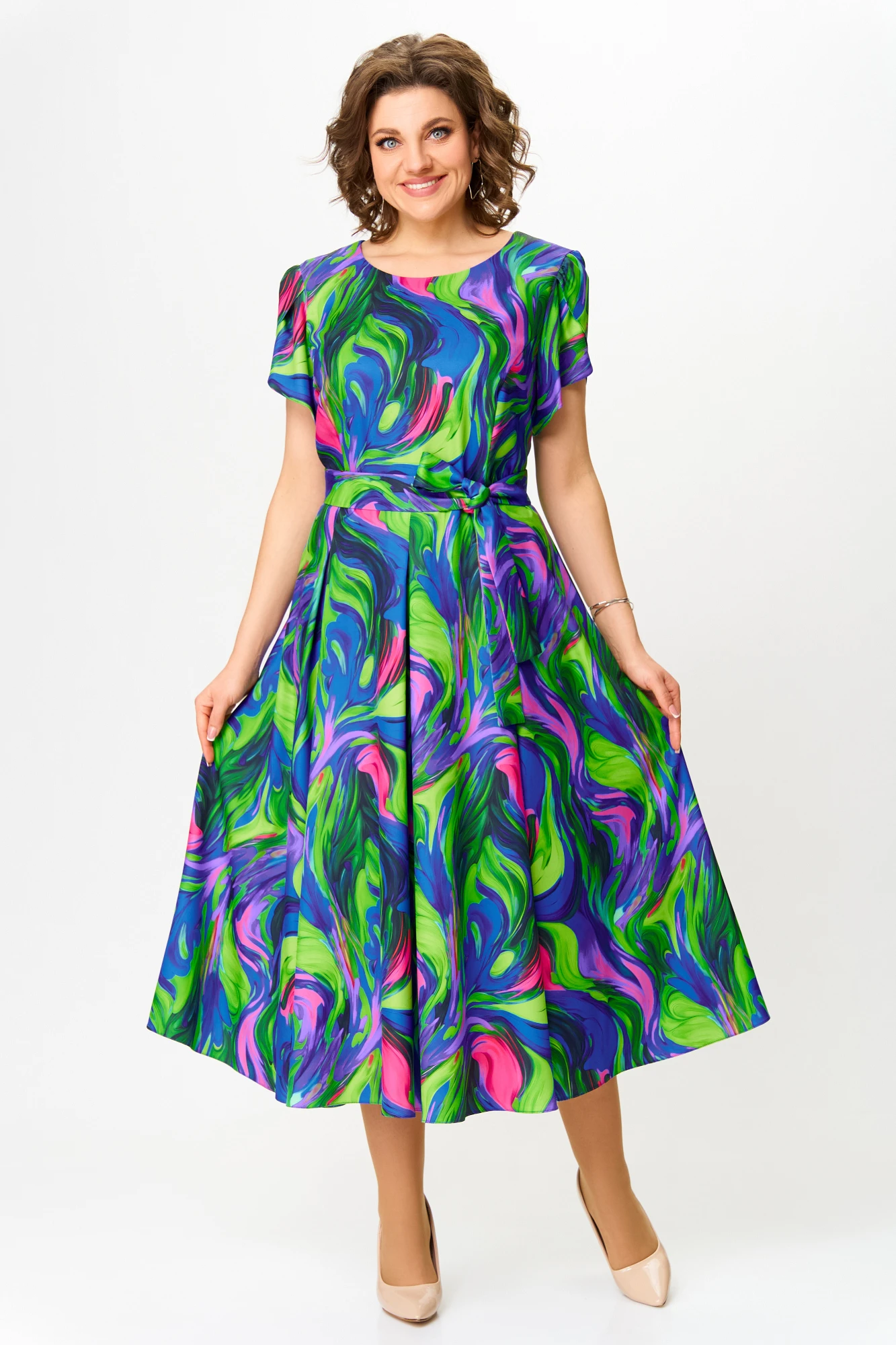 Платье из мягкой вискозной ткани Х-образного силуэта с полуприлегающим лифом. Платье отрезное по линии талии. По переду лифа расположены рельефы, по спинке лифа талиевые вытачки. Юбка расклешенная из шести клиньев со встречными складками по линии талии. В среднем шве спинки предусмотрена потайная тесьма-молния. Рукав втачной покроя тюльпан, длина рукава 15 см. В комплекте ремень с декоративной пряжкой.
