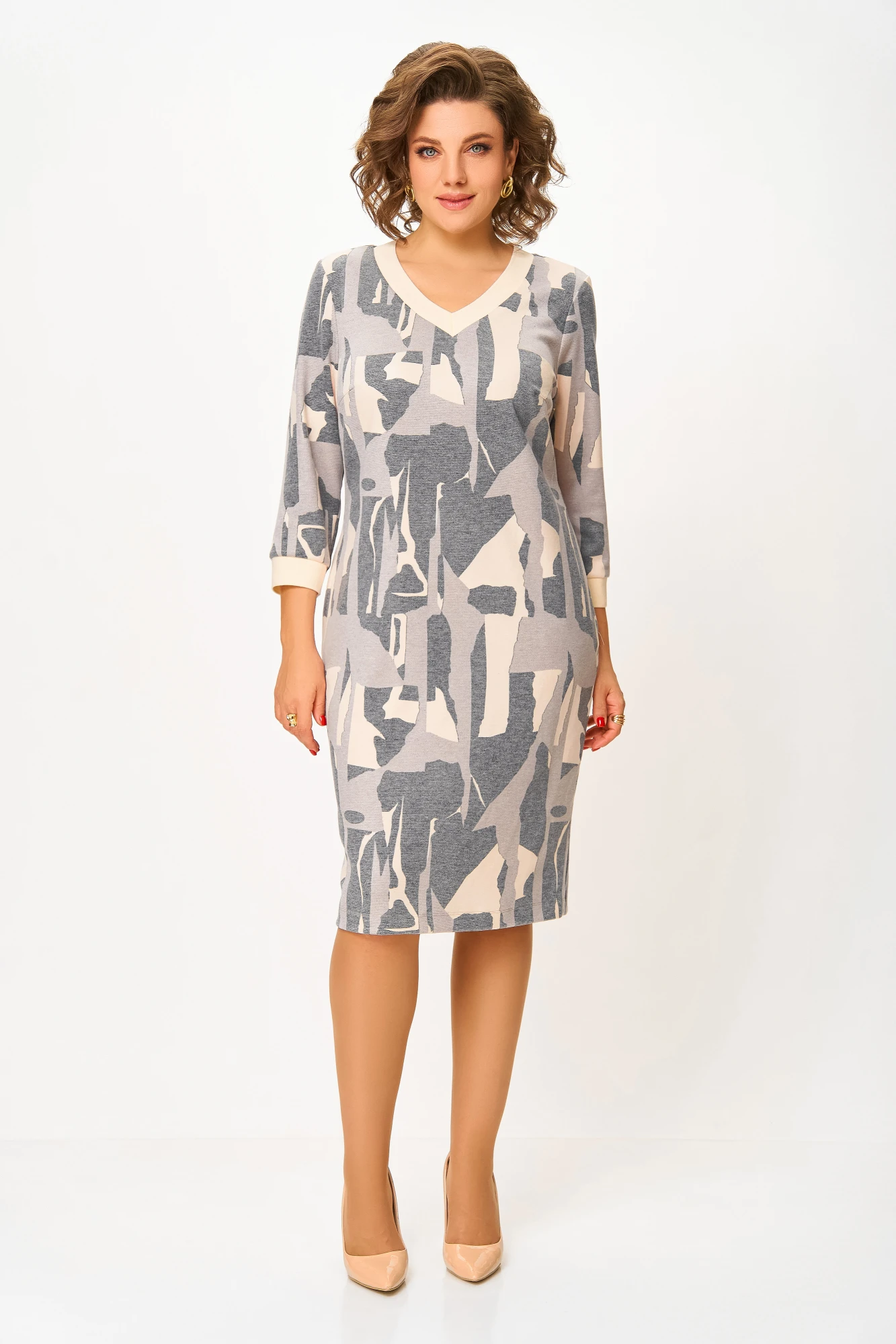 Платье из эластичного трикотажного полотна полуприлегающего силуэта. По переду обработаны нагрудные вытачки. Спинка цельнокроеная. Рукав втачной одношовный длиной 4/5 с манжетой из декоративного трикотажного довяза. В боковых швах обработаны карманы. Горловина V-оборазной формы, обработана декоративным трикотажным довязом.