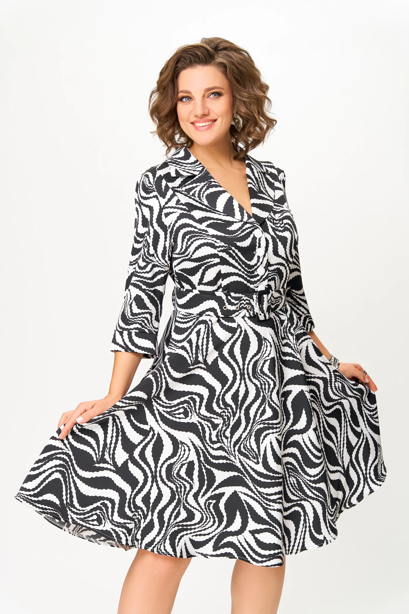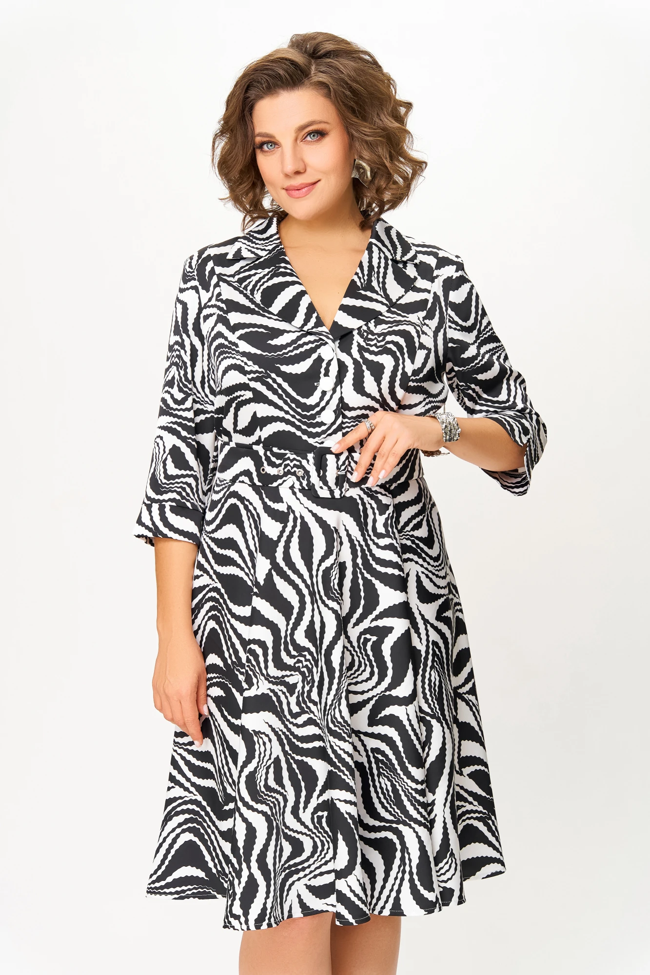 Платье из поливискозной ткани с сатиновым блеском, Х-образного силуэта с полуприлегающим лифом. Платье отрезное по линии талии. Перед лифа с вертикальными рельефами и застёжкой на петли и 4 декоративные пуговицы. Горловина V-образной формы, с отложными лацканами и воротником пиджачного типа. Спинка лифа с талиевыми выточками. Рукав втачной, длиной ¾, по низу манжет с разрезом. Застёжка в боковом шве на потайную тесьму молнию. В комплекте пояс из основной ткани с пряжкой.