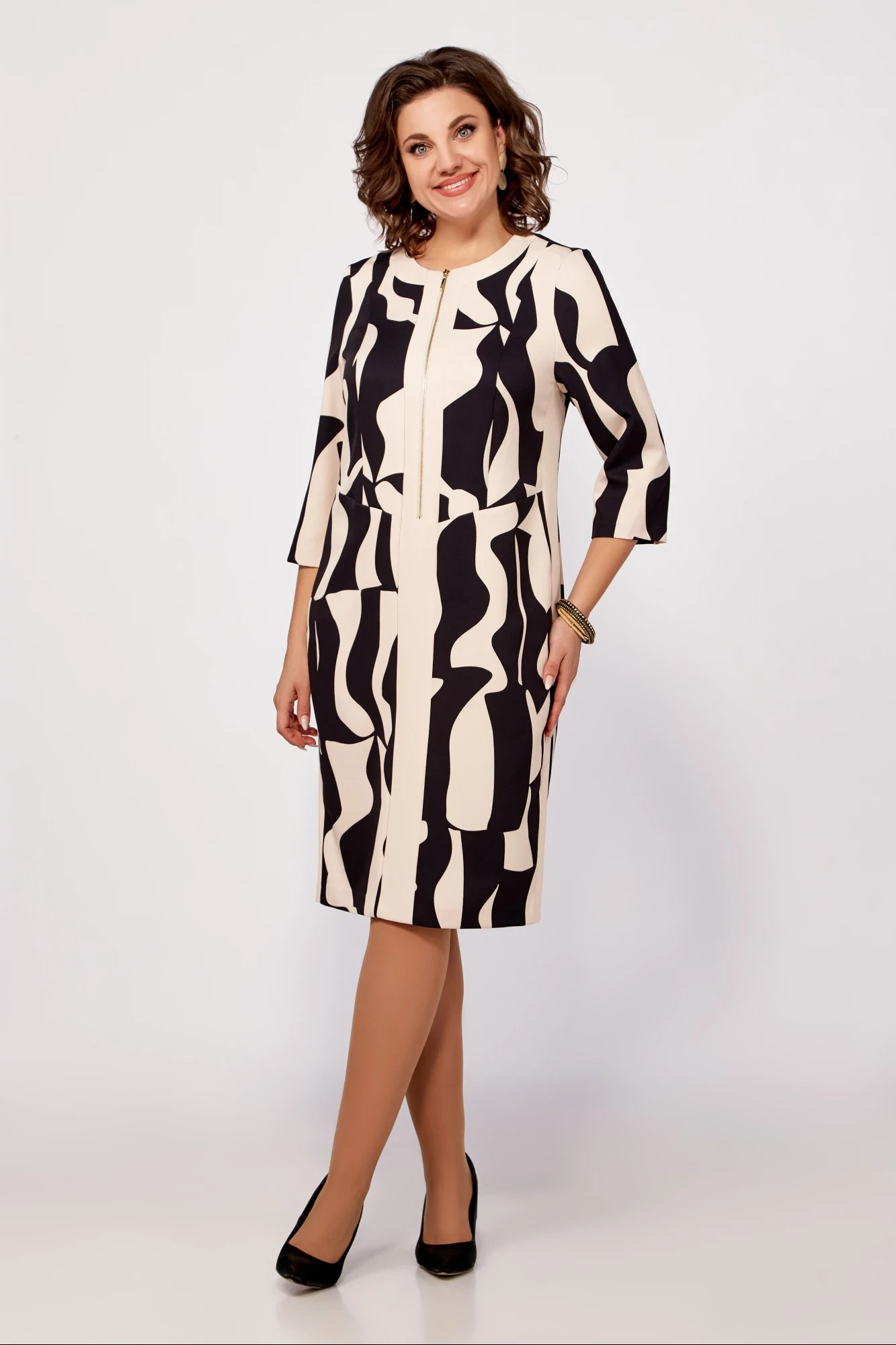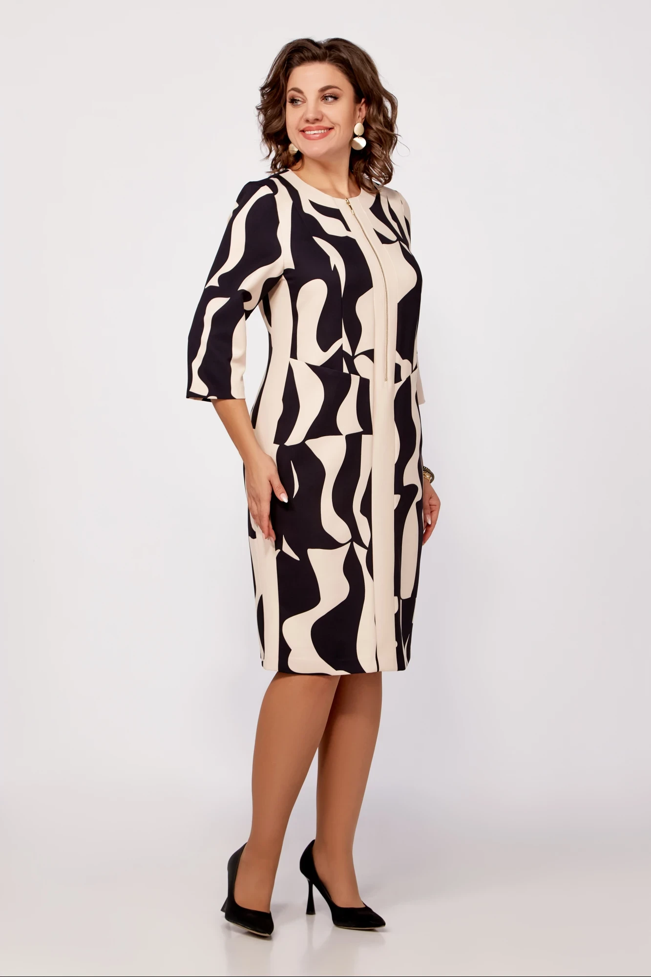 Платье полуприлегающего силуэта из поливискозной ткани, выполнено в комбинации расцветки в принт и однотон. Спереди, по центру планка из однотонной ткани переходящая в отделку горловины. В верхней части планки металлическая молния, длиной 40 см. По бокам вставки из однотонной ткани.