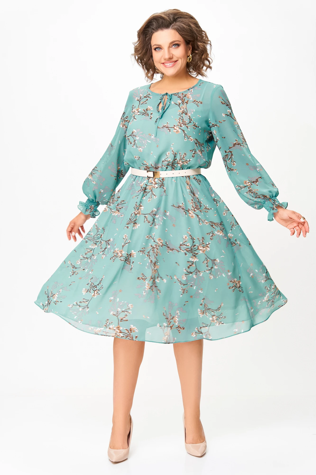Платье длиной миди, выполнено из шифона на трикотажной подкладке. Лиф отрезной по линии талии. Талия регулируется эластичной тесьмой (резинкой). Нижняя часть платья А-силуэта. Подкладка верхней части платья на бретелях. Рукав втачной длинный, в нижней части собран на эластичные строчки, которые внизу образуют рюшу . Горловина округлой формы, по центру переда капелька с завязкой.