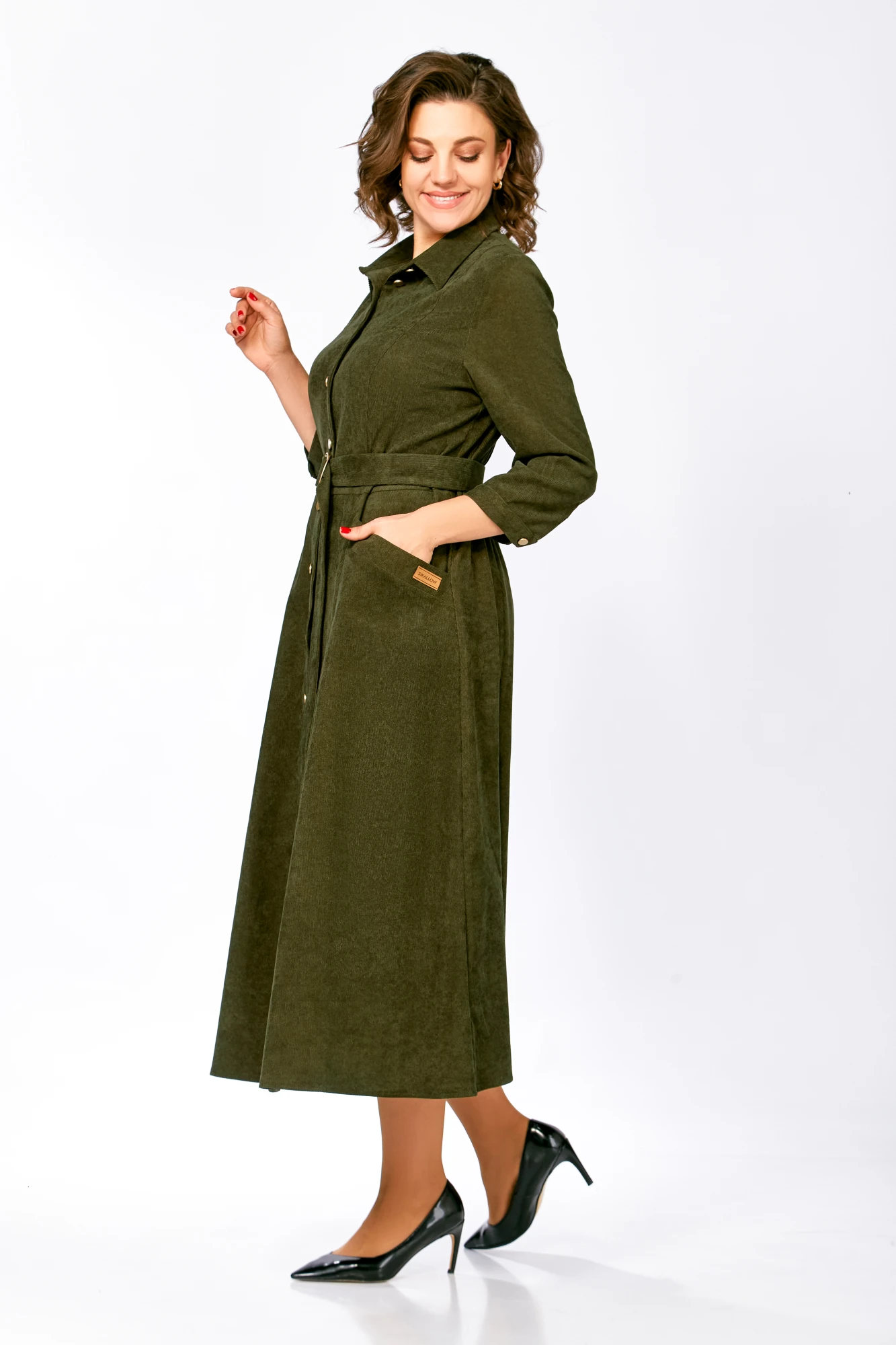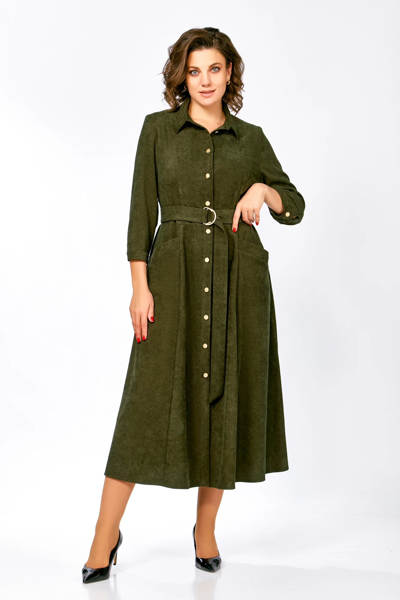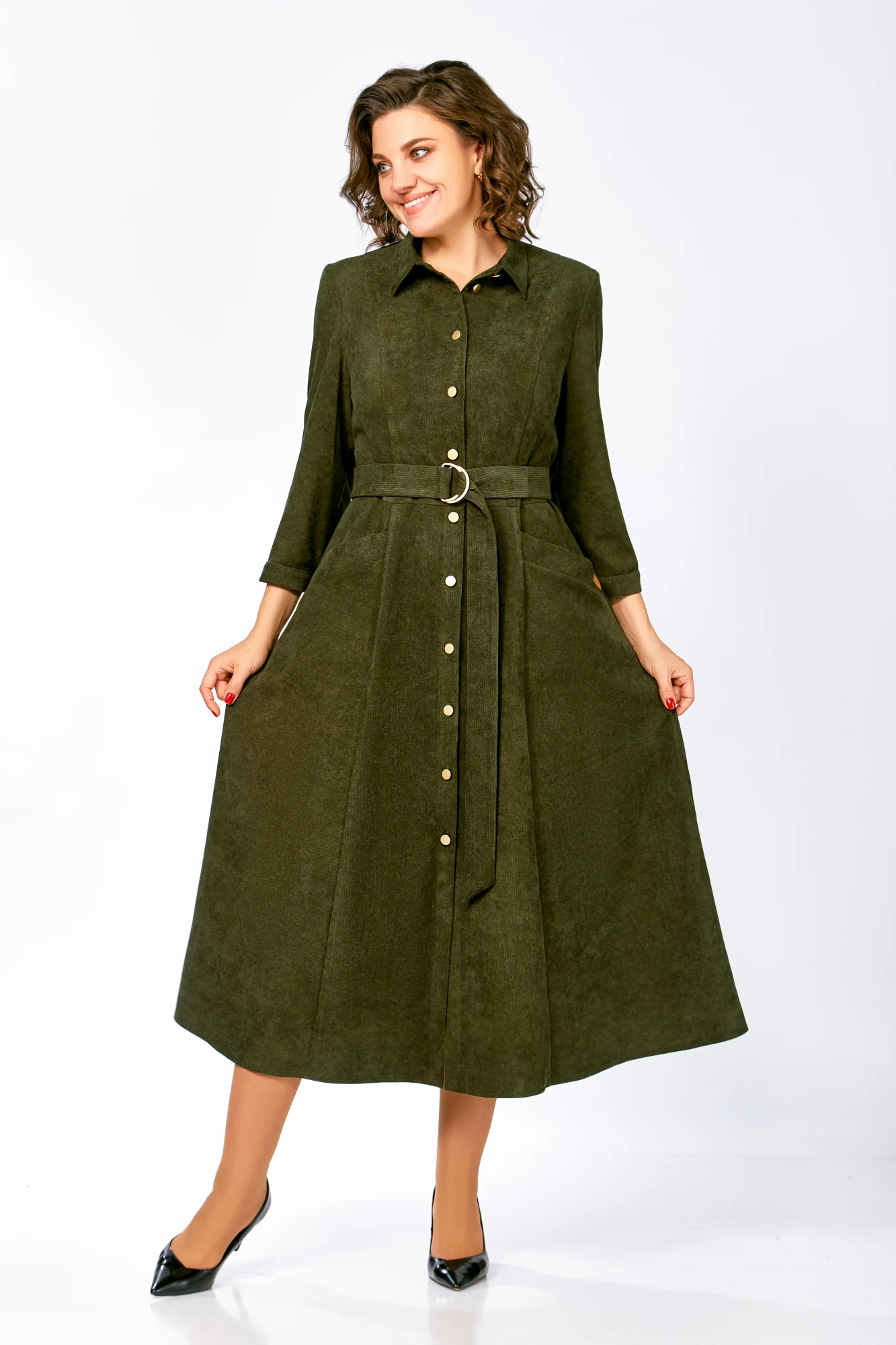 Платье из мягкой ткани вельвет, отрезное по линии талии с полуприлегающим лифом и юбкой А-силуэта, с центральной застёжкой на петли и декоративные пуговицы.
