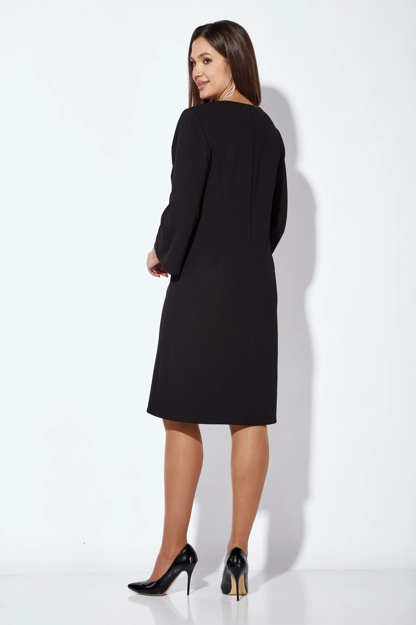 Платье женское, А силуэта, с втачным рукавом, длинной 3/4. Рукав расширенный к низу с разрезом по шву. Разрез зафиксирован на навесную петлю и отделочную пуговицу. Вырез горловины фигурной формы. Перед задекорирован вышивкой из паеток. По спинке средний шов и талевые вытачки. Застежка на потайную тесьму "молния" в среднем шве.