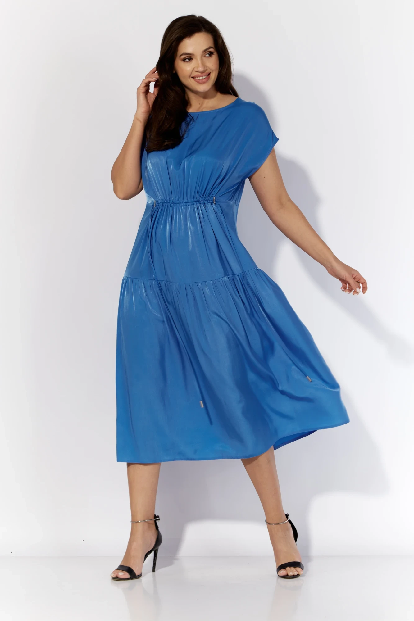 Платье женское, свободного силуэта, расширенное к низу. Рукав короткий, цельнокройный. Горловина круглой формы.По спинке небольшой разрез в средном шве, акцентирован декором "монетка" Разрез выше линии тали, по переду регулируется с фиксаторами. По центру спинки небольшая сборка. Подрез по линии бедер оформлен присобранным воланом.