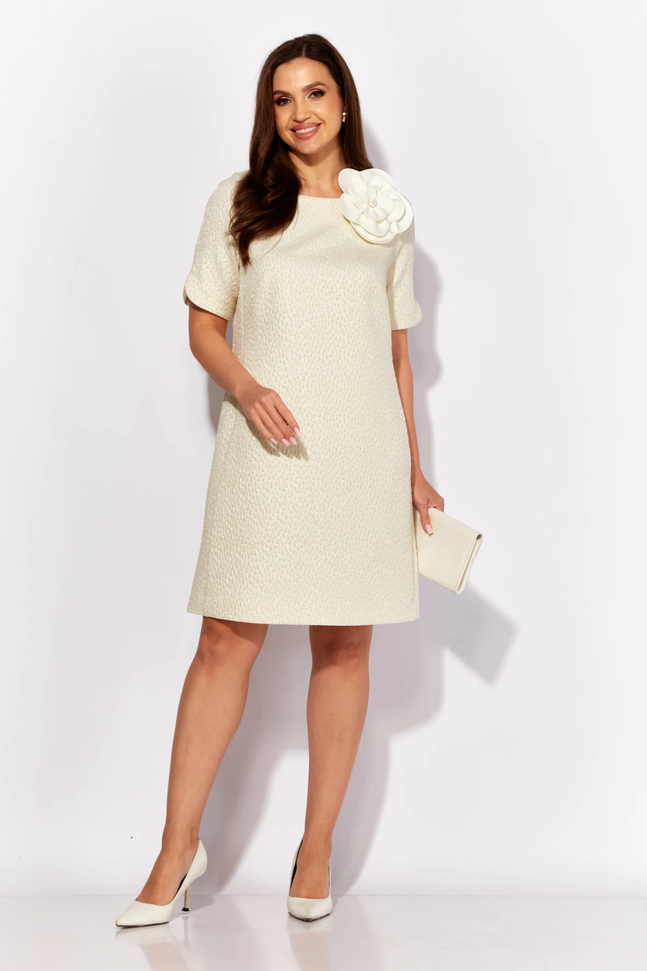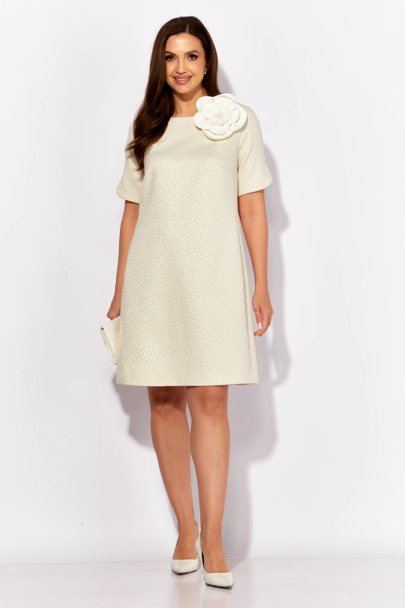 Платье женское, А силуэта с коротким рукаквом. Рукав покроя "реглан" с фигурным разрезом. Вырез горловины круглой формы. По спинке застежка на навесную петлю и пуговицу и вырез "капля" Силуэтность платью придают рельефы переда и спинки с цельнокройными бочками. Декором служит съемный цветок из отделочной ткани.