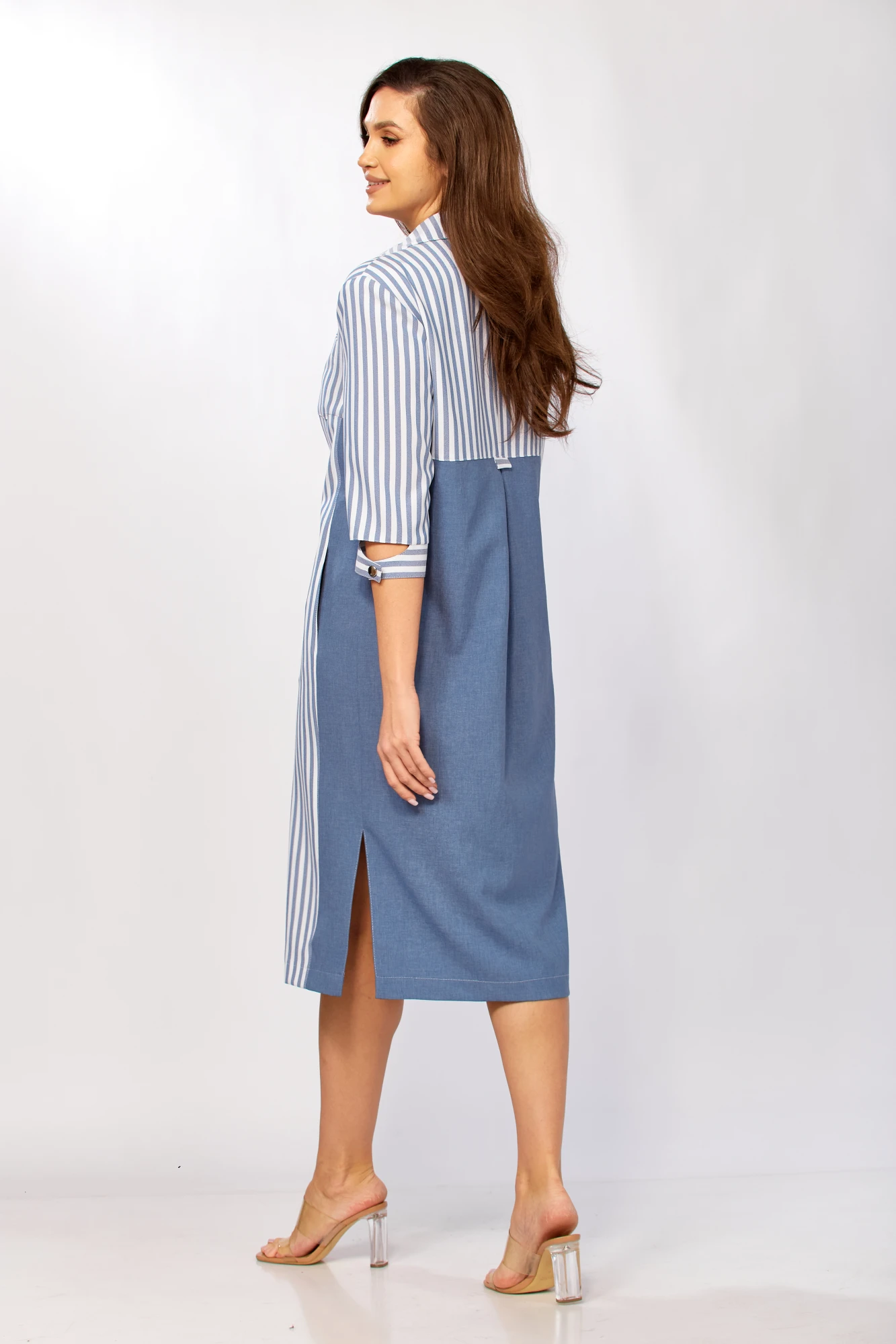 Стильное платье прямого силуэта, комбинированное из двух видов ткани. Продуманные линии кроя выгодно обрамляют фигуру, а сочетание однотона и полоски добавляет образу графичности и стиля.
