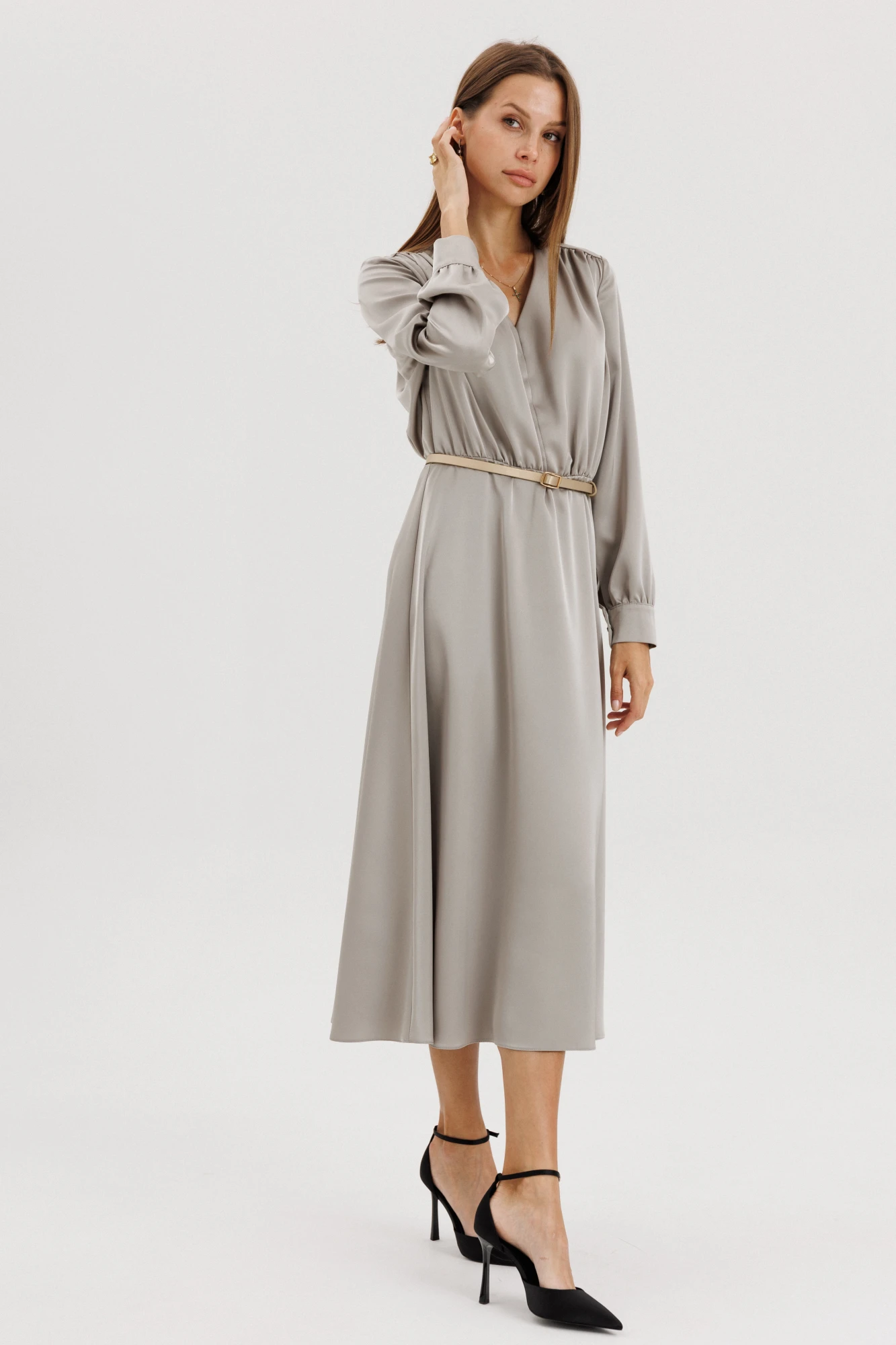 Платье из вискозного атласа, в комплекте с декоративным поясом . Платье А-силуэта, отрезное по талии, юбка расширенная к низу со сборкой, платье на резинке, кокетка отрезная, со сборкой по полочке и спинке , горловина V-образная, , рукав втачной с манжетой и застежкой на пуговицу. Идет в комплекте с поясом . Длина платья 122 см. Длина рукава 61 см. Рост модели на фото 178 см.