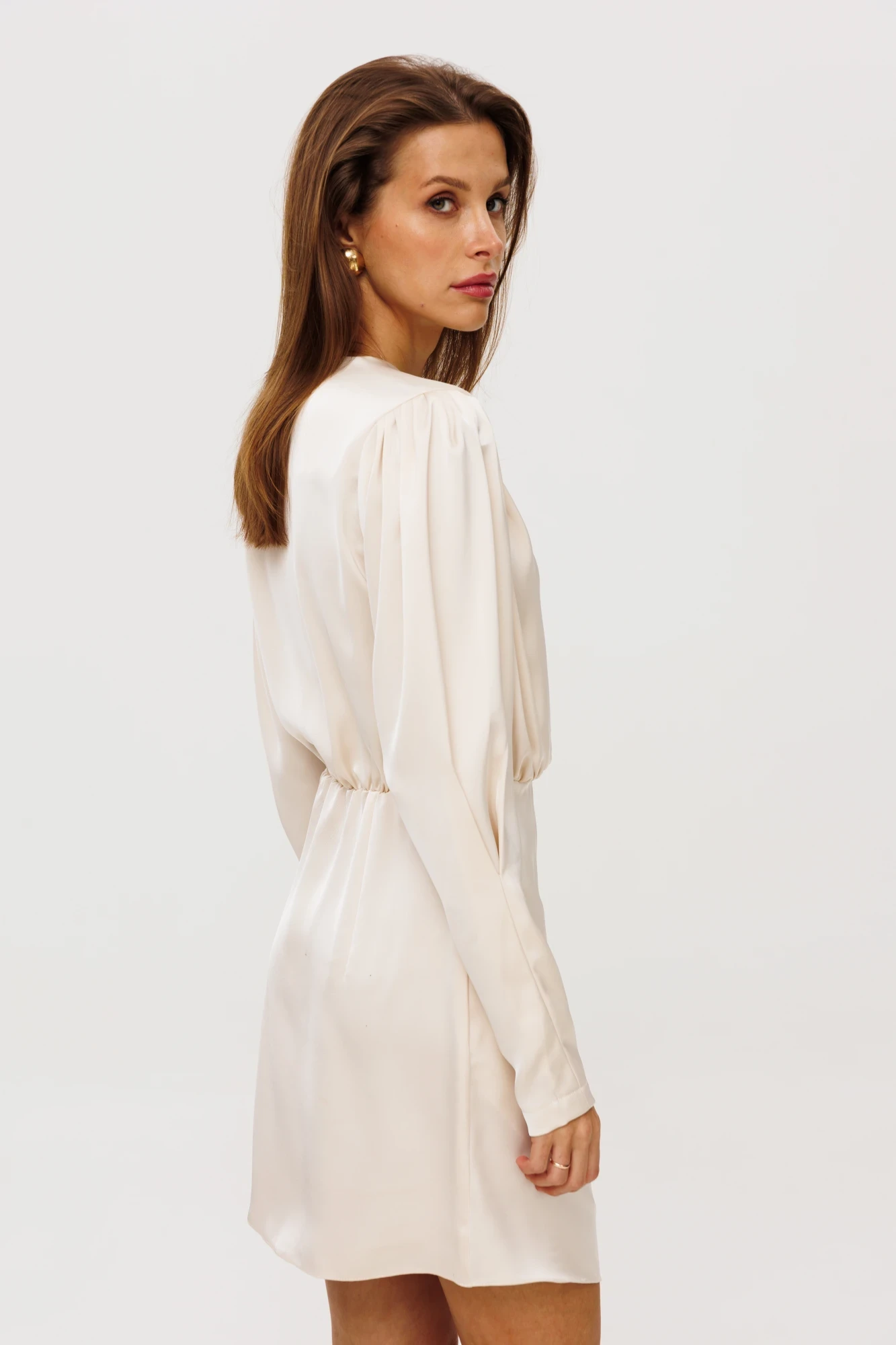 Платье на запах из вискозной атласной ткани свободного силуэта ,молния в боковом шве, талия отрезная, на резинке, драпировка по переду, без подкладки. Рукав втачной с драпировкой по окату , зауженный к низу. Длина по спинке 84 см, длина рукава 64 см , полуобхват талии 33 см в 42-м размере.