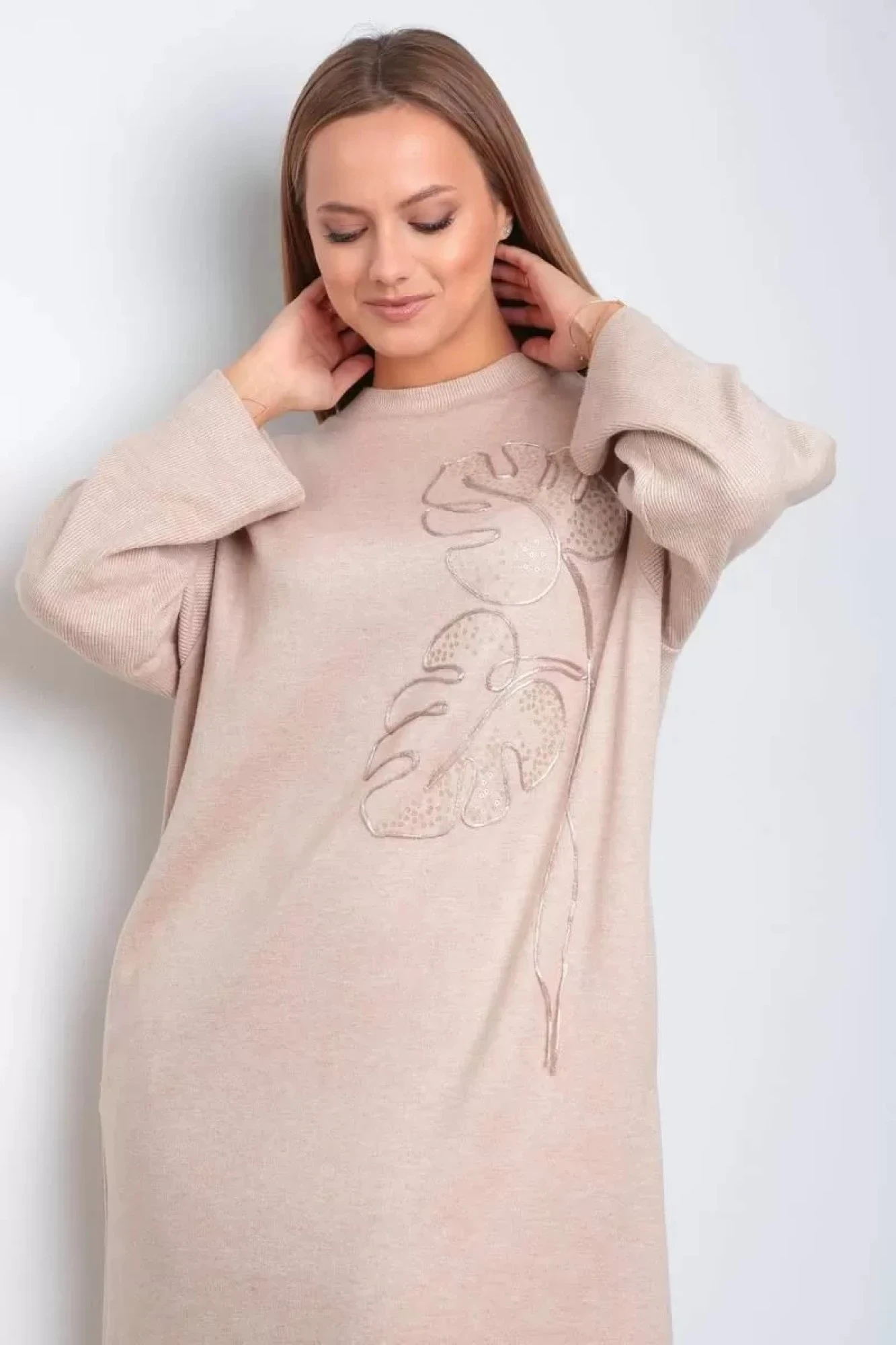 Платье женское трикотажное прямого силуэта с декоративной вышивкой по переду. Линия плеча спущена, рукав втачной длинный. Горловина с планкой из основной ткани. Перед и спинка цельные, в боковых швах карманы, с левой стороны разрез.