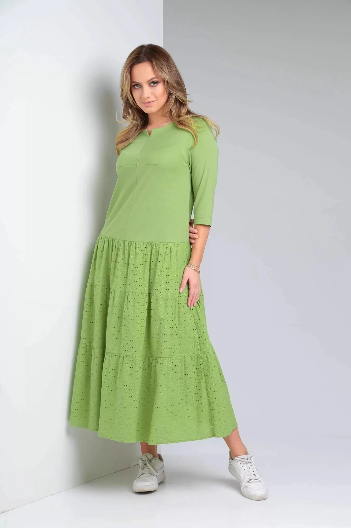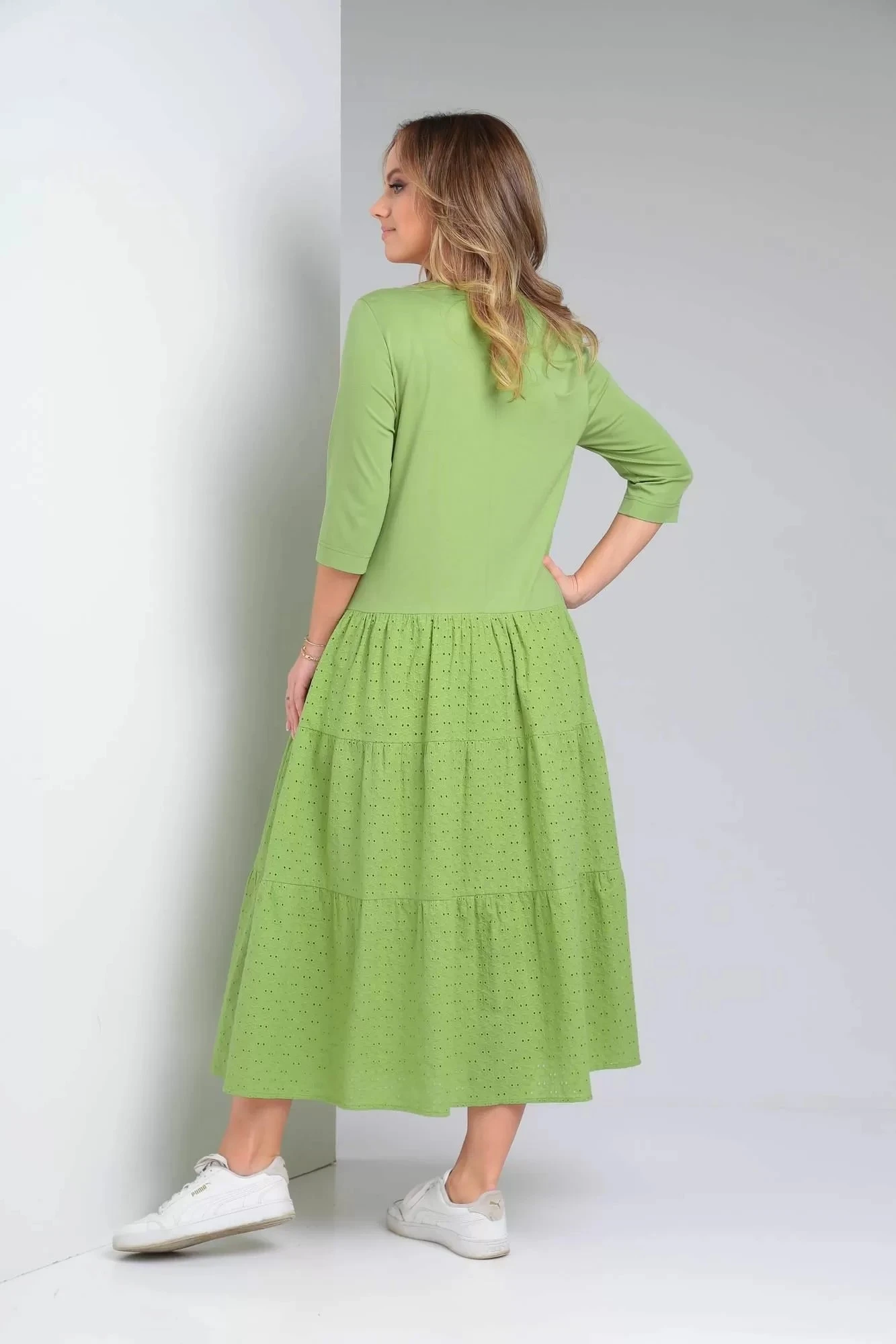 Платье в стиле бохо. Лиф платья из трикотажного полотна, низ из хлопковой ткани шитье. По переду лифа средний шов с небольшим разрезом в области горловины. Низ платья в виде юбки с отрезными воланами, на подкладке. Горловина округлой формы, обработана обтачкой. Рукав втачной укороченный.