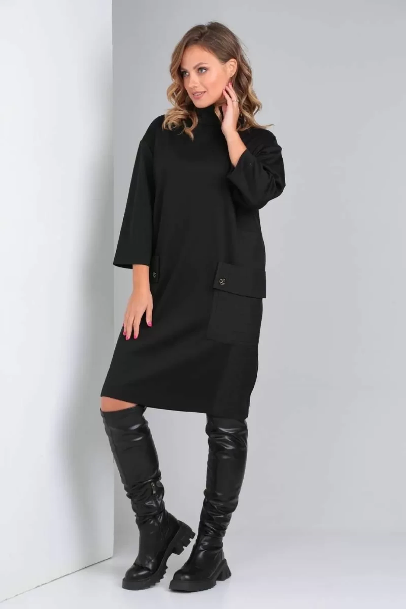 Платье прямого свободного силуэта выполнено из двух видов ткани: трикотажного полотна и жаккардовой ткани. Центральные части переда и спинки - трикотаж. Боковая часть платья - из отделочной ткани. Спереди большие накладные карманы с клапаном, который фиксируется пуговицей. Воротник-стойка. Линия плеча спущена. Рукав втачной, прямой.