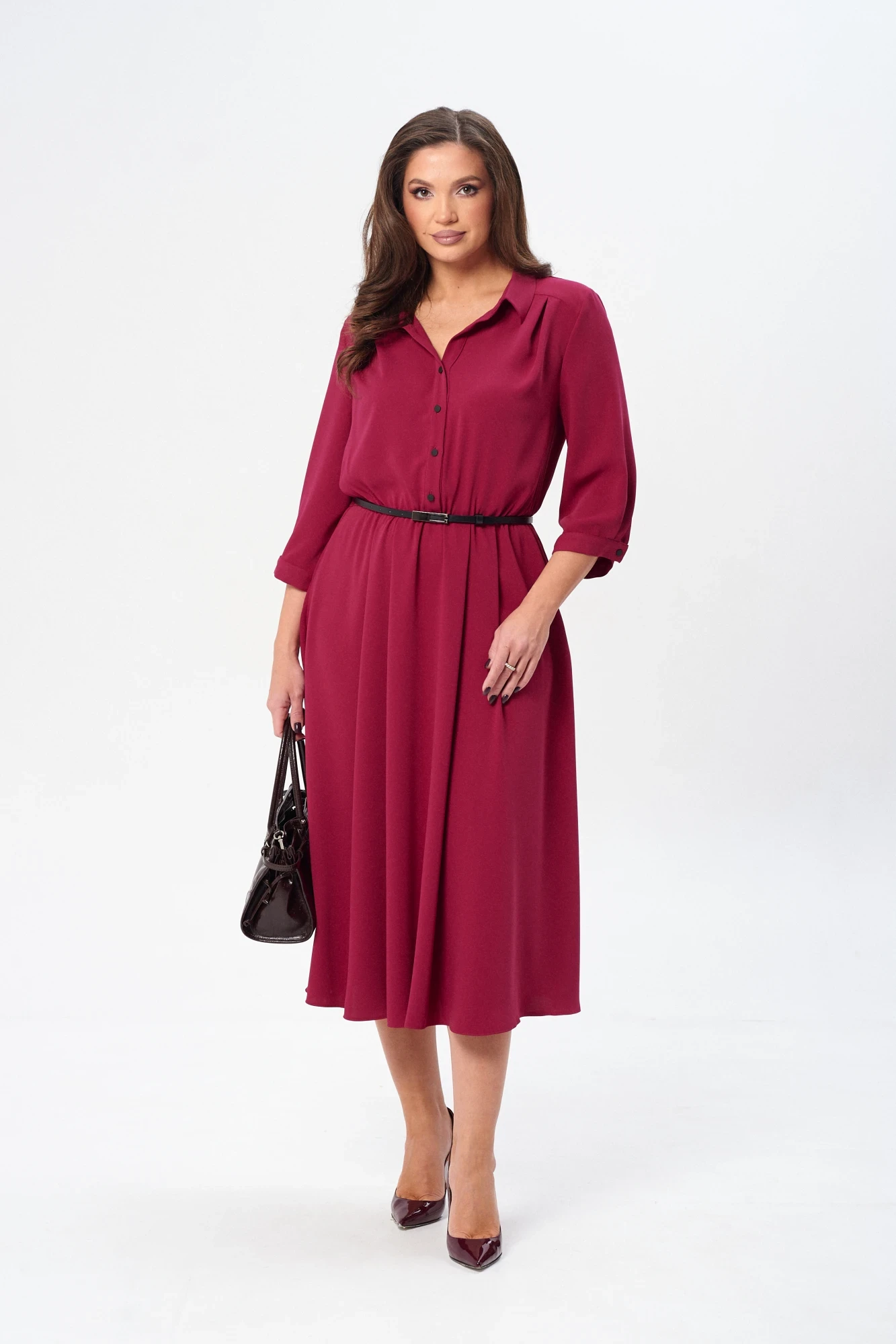 Платье женское свободного покроя из вискозной ткани, отрезное по линии талии (собрано на эластичную тесьму), юбка клешёная. По переду по центру застёжка на петли-пуговицы; спереди кокетка и встречная складка. По лифу спинки кокетка с небольшой сборкой. Воротник рубашечного типа на стойке. Рукав втачной 3/4 на манжете с пуговицей.