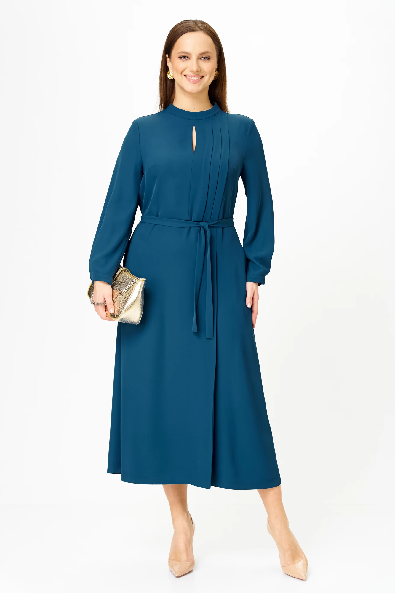 Платье женское полуприлегающего силуэта отрезное по линии талии, нижняя часть в виде расширенной к низу юбки миди. Лиф переда с ассиметричным элементом-вертикальные складки, по центру шов с небольшим разрезом выше линии груди, вытачки из боковых швов. По лифу спинки средний шов с разрезом и застежкой на навесную петлю и пуговицу. Горловина округлой формы, воротник-плосколежащая стойка. Рукав втачной одношовный на манжете. По нижней части переда ассиметричная глубокая складка, имитирующая запах. Нижняя часть спинки цельная. В боковых швах функциональные карманы. В комплекте сьемный пояс из основной ткани.