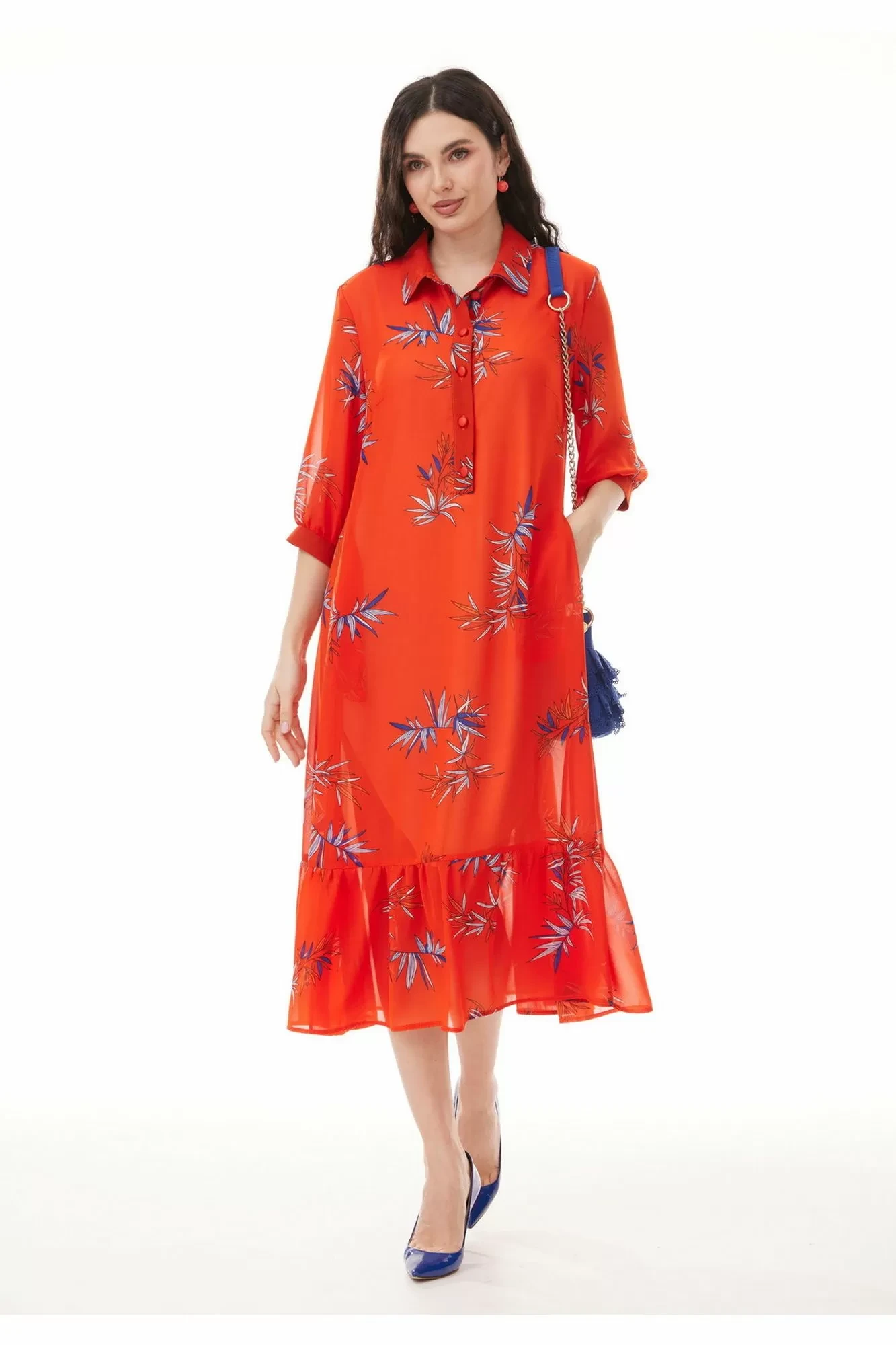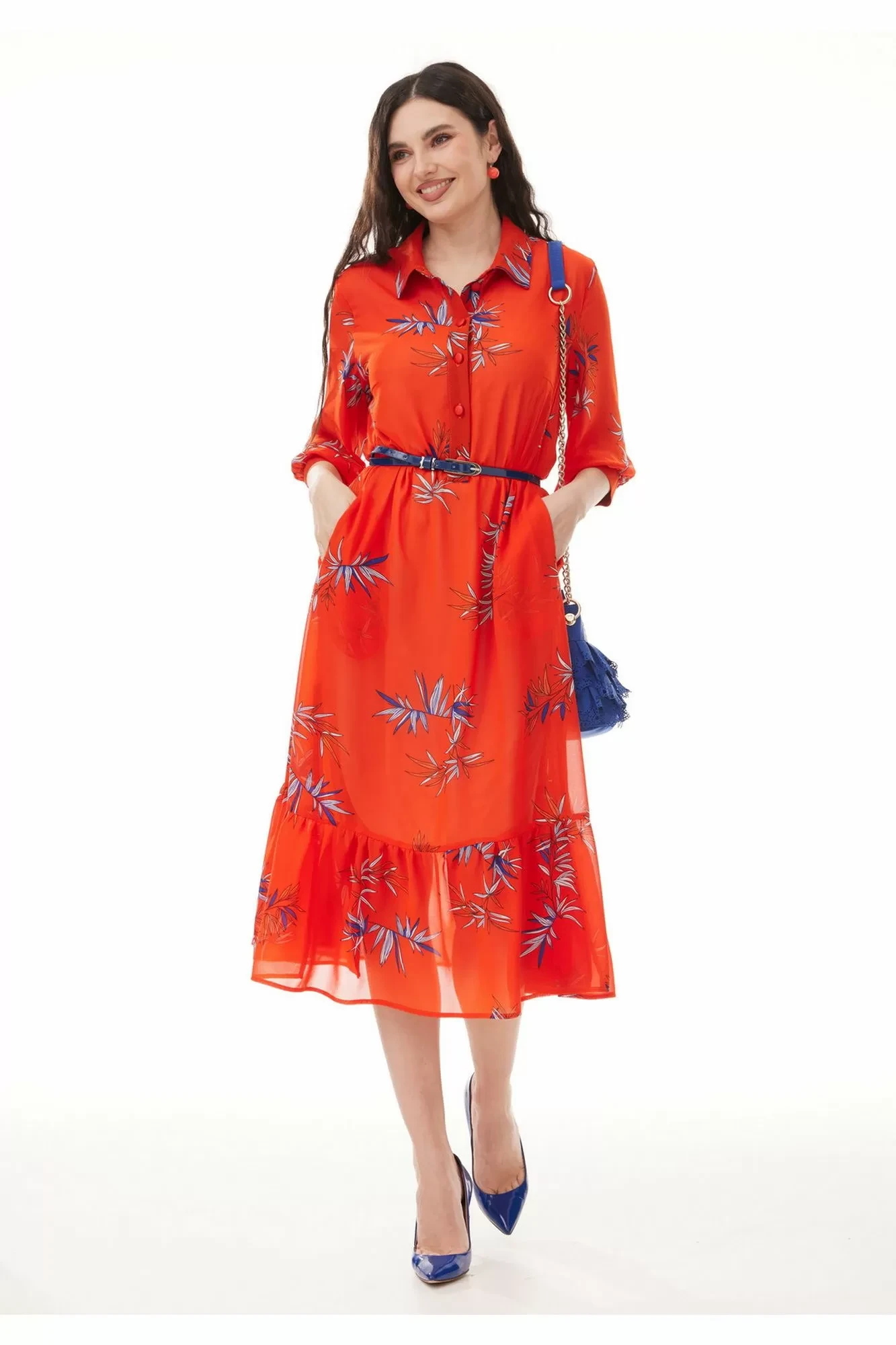 Платье А-силуэта, на подкладке, длиной мидакси, выполненное из итальянского шифона с принтом. Платье с центральной планкой до линии талии, которая застегивается на петли и пуговицы. Горловина платья с воротником рубашечного типа. Платье с рельефами по переду и спинке. В передних рельефах, в области бедер обработаны карманы, по низу - разрезы. По нижней части платья - притачной волан. Рукав втачной, одношовный, по низу рукава - притачная манжета, застегивающаяся на петлю и пуговицу. В комплект входит декоративный контрастный ремень из экокожи.