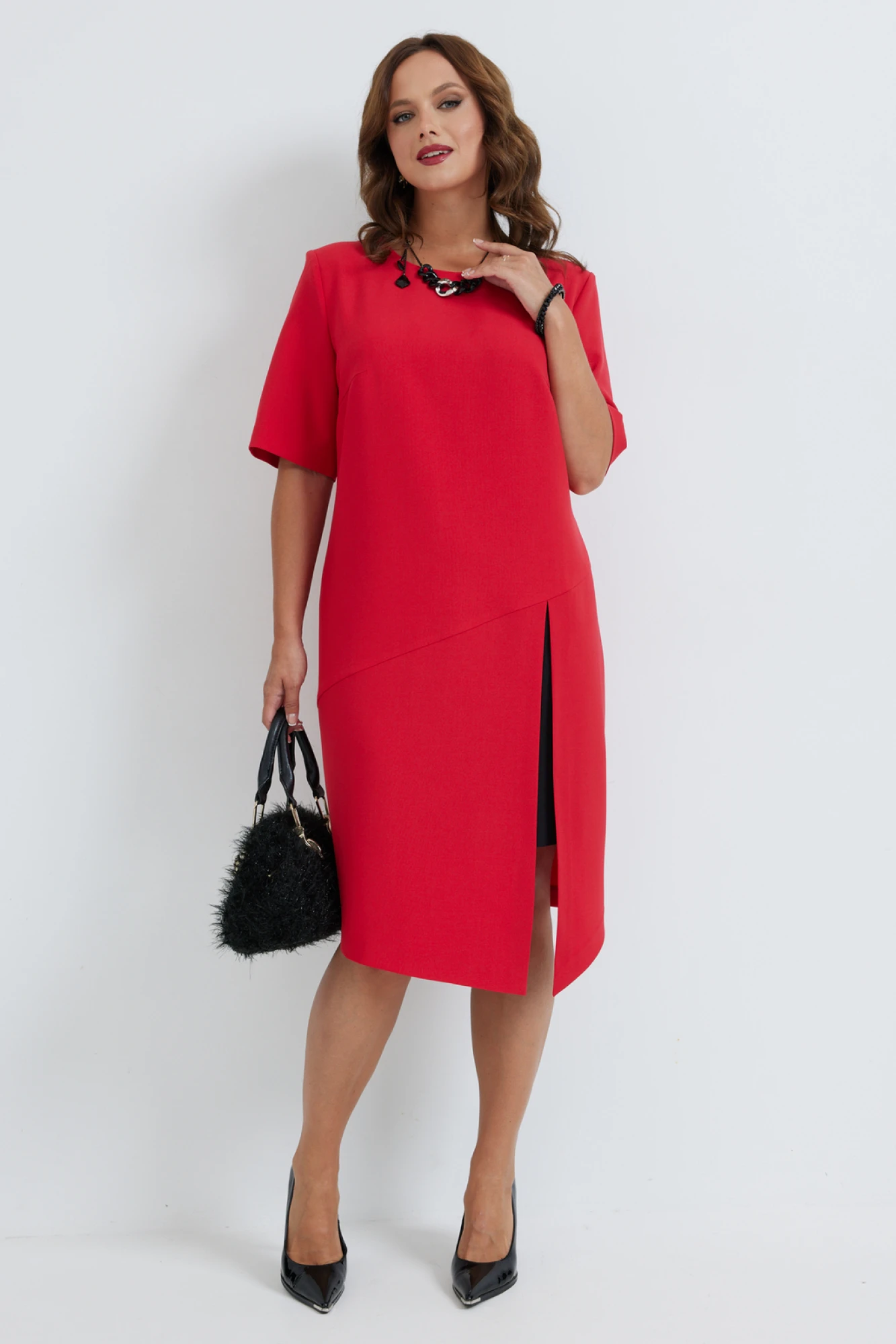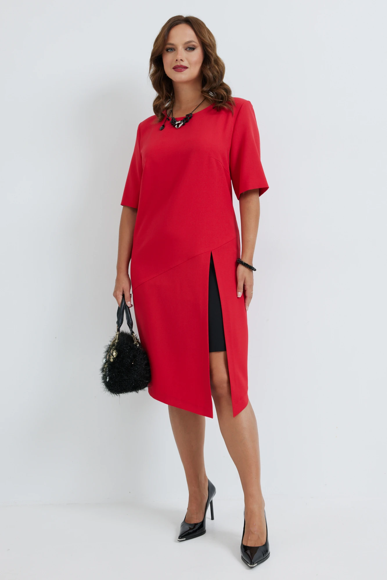 Эффектное платье прямого силуэта, выполненнное из поливискозы двух цветов. Перед платья с круглой горловиной и нагрудными вытачками. Перед платья в области бедра с косым подрезом. Нижняя часть переда состоит из верхней и нижней юбки. Верхняя юбка с косым низом и разрезом. Нижняя юбка из ткани контрастного цвета, имитирующая вторую юбку. Спинка с потайной молнией в среднем шве. Рукав втачной, длиной до линии локтя. В комплект к платью входит декоративная подвеска.
