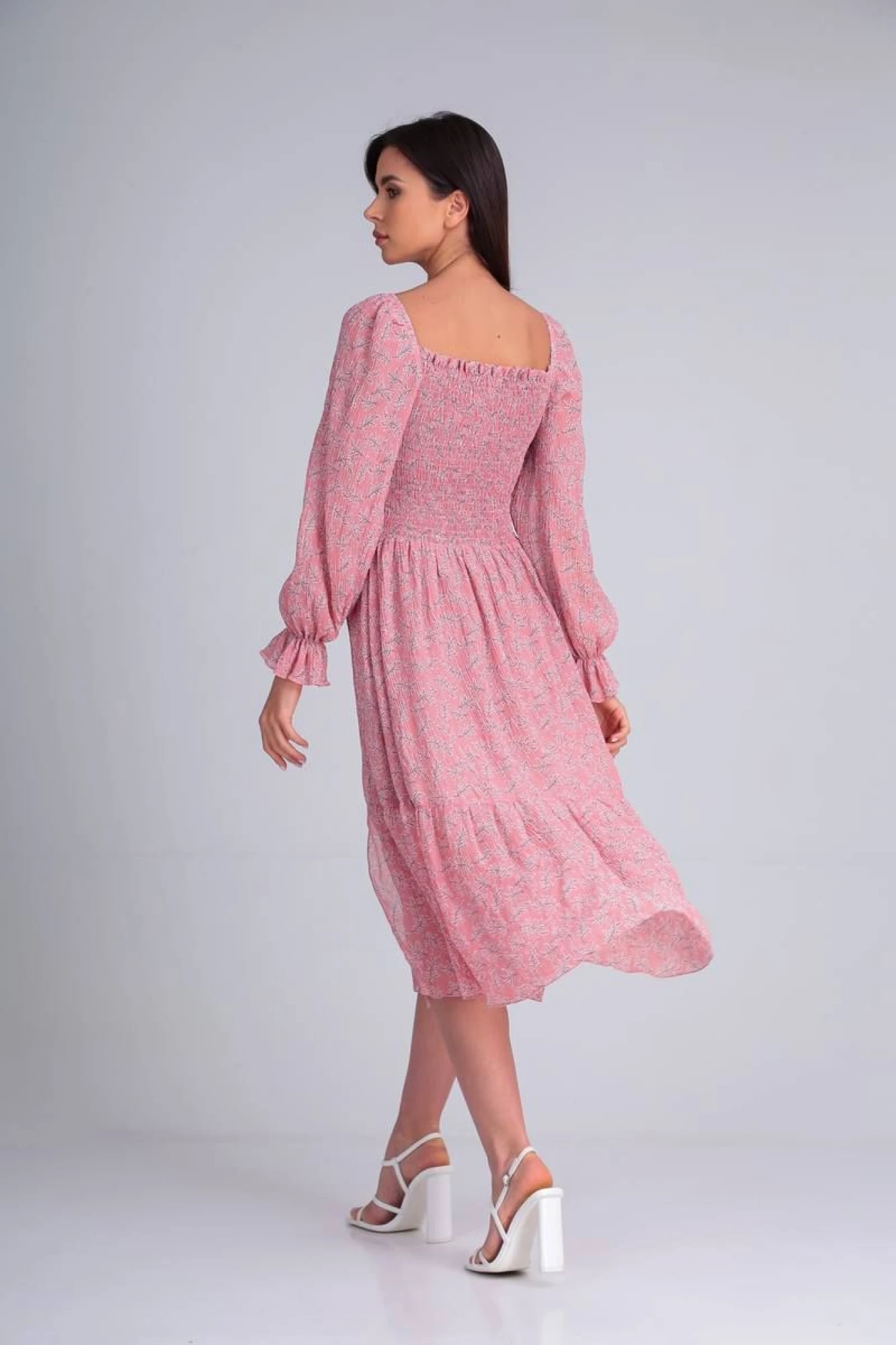 Платье-миди из шифоновой ткани. Вырез горловины каре и длинные присборенные рукава. Широкая вафельная сборка по лифу, что создает облегающий силуэт. Отрезное по талии и слегка расклешенная юбка с разрезом спереди. По низу юбки подкладка.