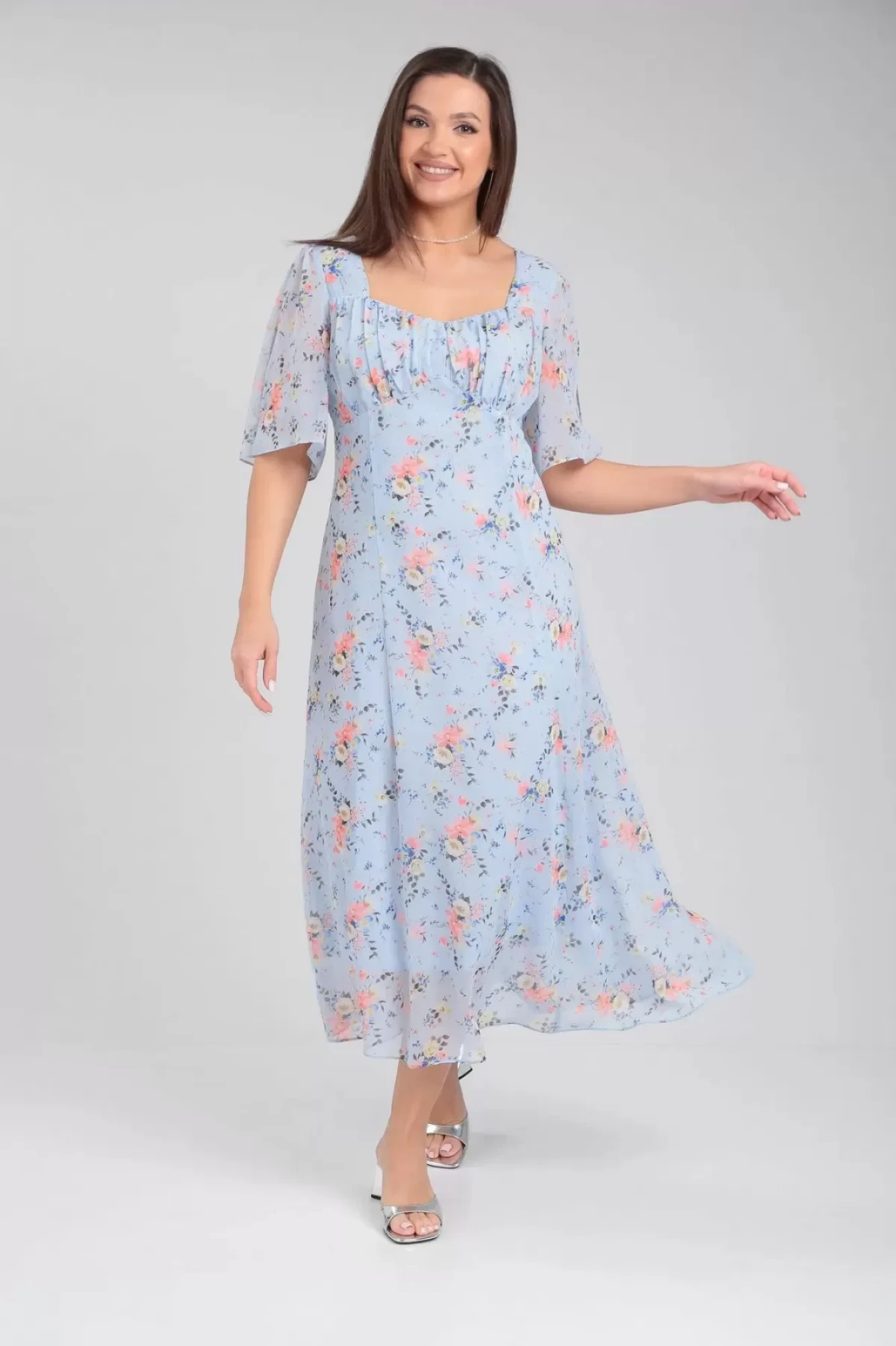 Нарядной женское платье выполнено из шифоновой ткани на трикотажной подкладке. Вырез горловины - фигурное “каре”. Короткий рукав с разрезами. Платье полуприлегающего силуэта. Лиф отрезной, со сборкой. Юбка расширенная к низу, с рельефами.