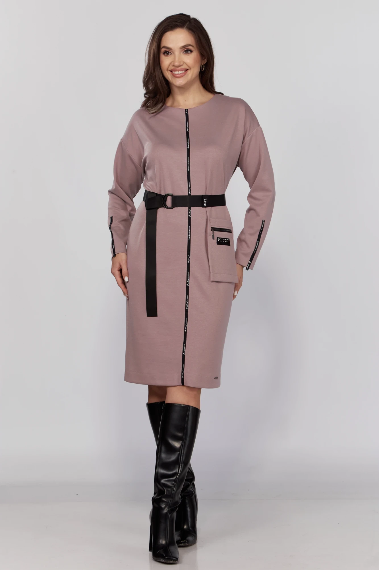 Платье женское прямого силуэта. Горловина округлой формы. Рукав спущенный, по низу рукава вставлена декоративная тесьма. По переду изделия вставлен рабочий карман. А также по переду обработана настрочная тесьма. В комплекте с изделием идет пояс.