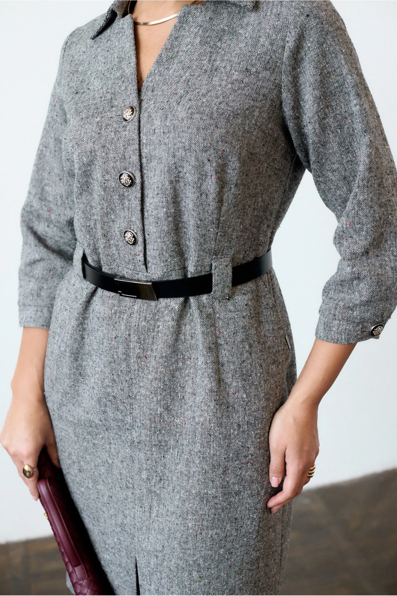 Платье полуприлегающего силуэта слегка зауженное к низу, выполнено из мягкой и качественной ткани “твид”. Рукав рукав втачной ¾ на манжете. Горловина V -образная с воротником на стойке. По переду платье отрезное, с функциональной застежкой на петли пуговицы. По переднему полотнищу карманы и разрез по низу среднего шва.