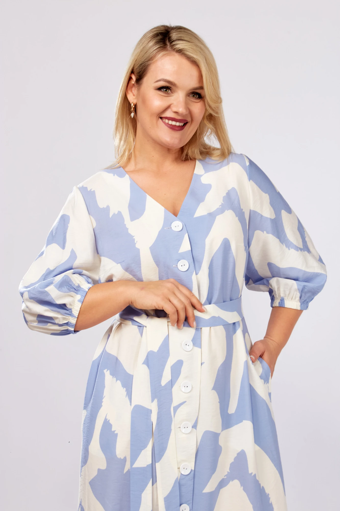 Платье женское А-образного силуэта с естественной линией плеча.Рукав втачной длиной 3/4. Низ рукава обработан резинкой.Горловина V-образной формы.Перед с нагрудной вытачкой и застежкой на петли-пуговицы.По низу переда и спинки обработана оборка.В боковых швах обработаны карманы.В комплект входит съемный пояс.