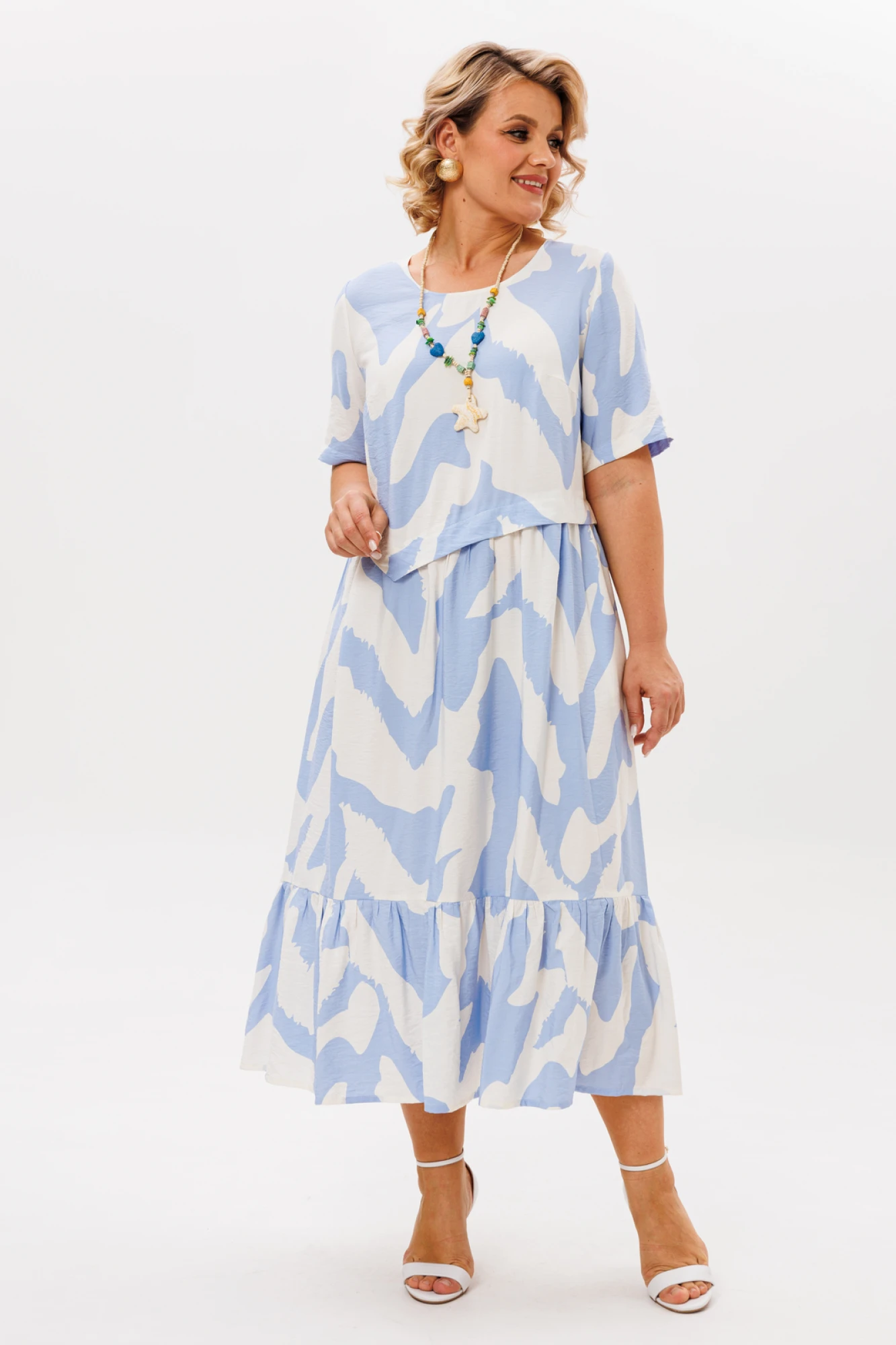 Платье женское А-образного силуэта с естественной линией плеча.Рукав втачной до линии локтя.Горловина округлой формы.Перед с нагрудной вытачкой и ассиметричным подрезом.По низу переда и спинки обработана оборка.В боковых швах обработаны карманы.В комплект входит съемная подвеска.