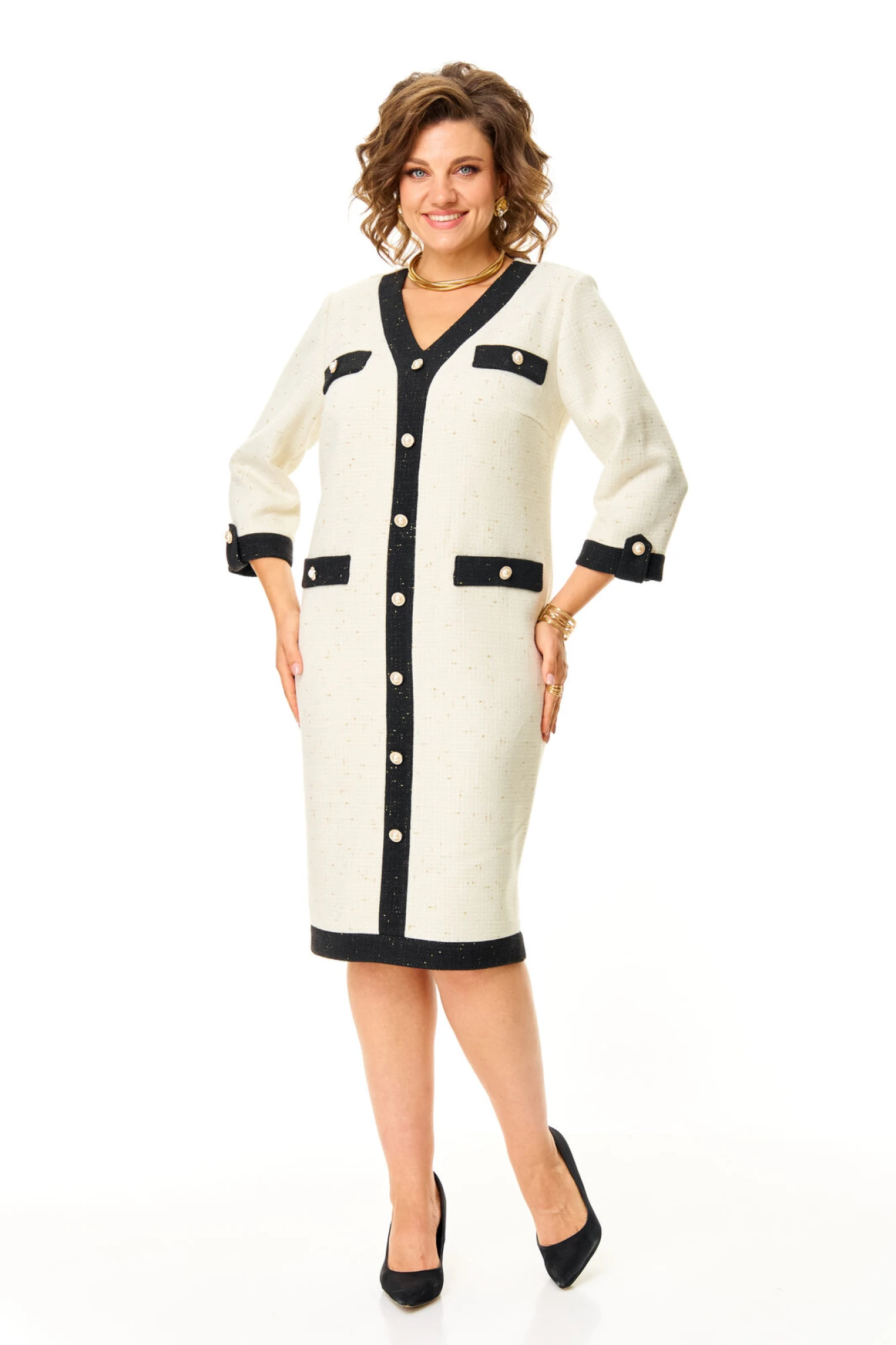 Платье прямого силуэта с естественной линией плеча на трикотажной подкладке.Спинка со средним швом и застежкой на молнию.Перед с нагрудными вытачками и отделочными настрочными листочками.По переду обработана отделочная отрезная планка.Вырез горловины V-образной формы.Рукав втачной одношовный длиной 3/4 с отделочной планкой по низу и патой.На изделие пришиты декоративные пуговицы.Ткань с добавлением шерсти, ворсистой фактуры с вплетением металлизированной нити.