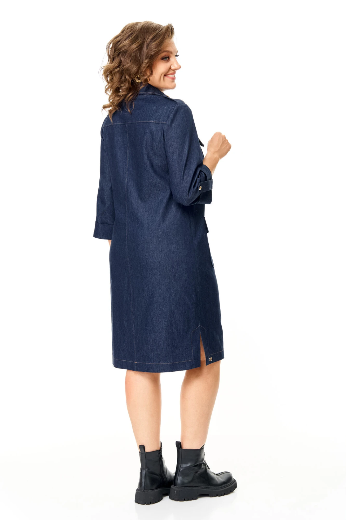 Платье прямого силуэта с естественной линией плеча.Спинка со средним швом и кокеткой.Перед с нагрудными вытачками, накладными карманами и клапанами.По переду обработана отделочная отрезная планка с застежкой на петли-пуговицы.Рукав втачной одношовный длиной 3/4 с отделочной манжетой и патой по низу.На плечевых швах имеются отделочные паты с пуговицами.В боковых швах выполнены невысокие разрезы.На правой стороне переда, по низу, пришита декоративная нашивка.Отделочные строчки контрастного цвета.Вся фурнитура металлическая premium качества.