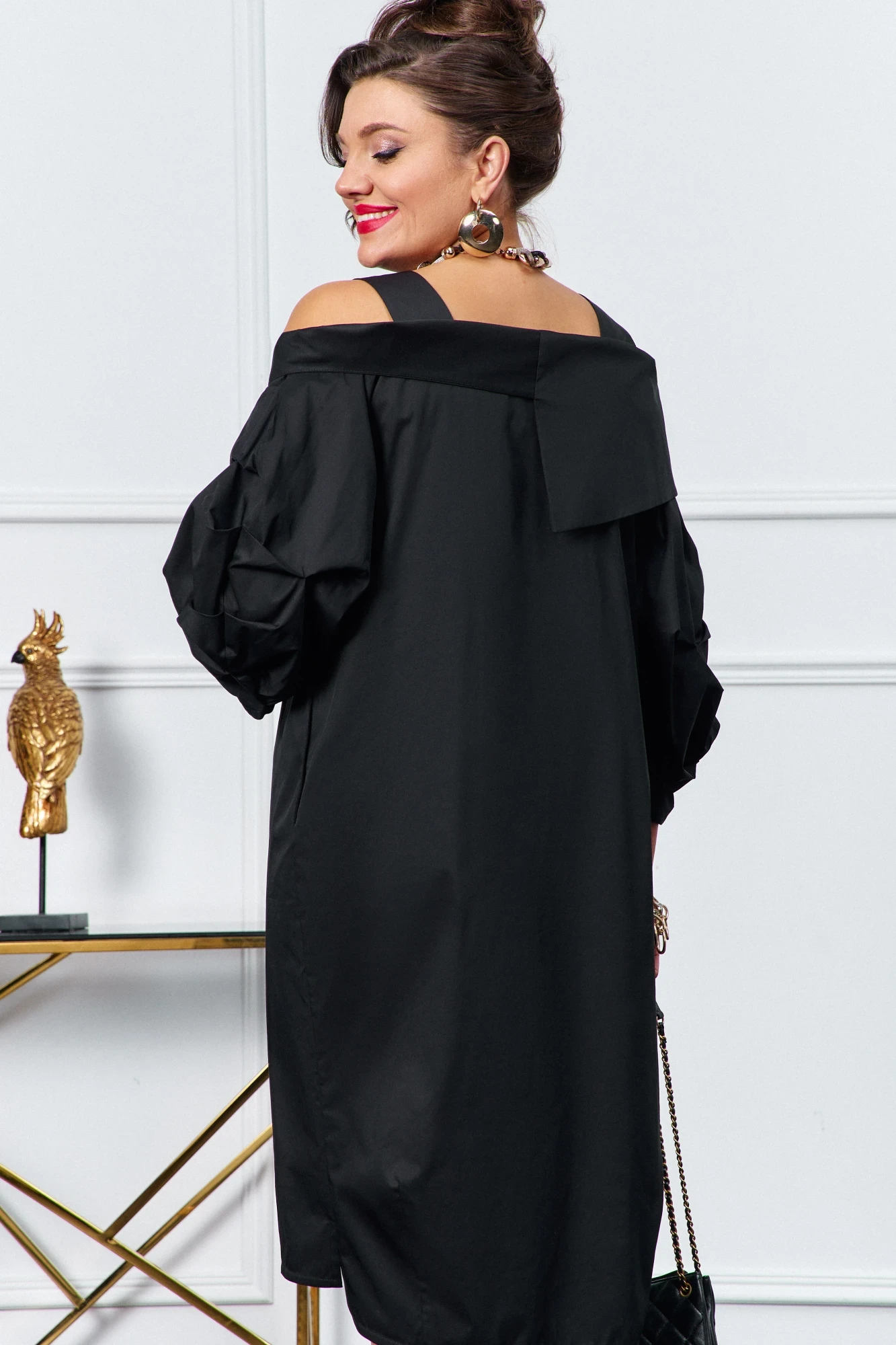 Платье свободного силуэта, слегка заужается к низу. По вырезу декольте -декоративный элемент в виде отложного ассиметричного воротника, по плечам платья широкие бретели. По переду платья функциональная застёжка на петли-пуговицы, смещённая от центра. Рукав в платье на основе реглана с декоративными защипами, которые придают рукаву пышность. Спинка в платье без особенностей с декоративными вытачками от низа. В боковых швах платья карманы, небольшие разрезы от низа.