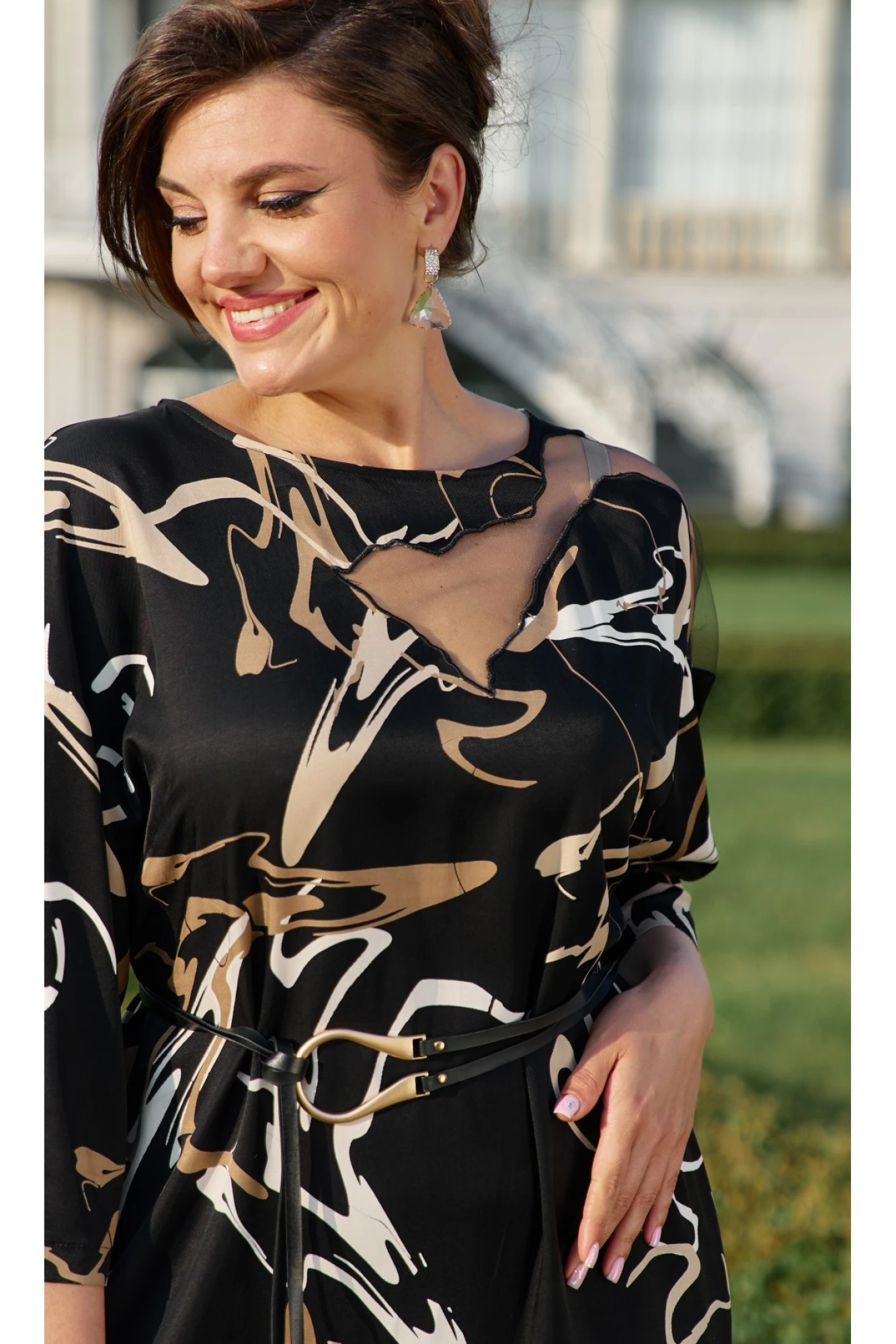 Чёрное платье с абстрактным дизайном в бежевых оттенках создаёт неповторимый и стильный образ. В целом, чёрное платье с абстрактным дизайном – это отличный выбор для тех, кто хочет выглядеть стильно и модно не боясь экспериментировать с образами. Платье выполнено из высококачественных материалов, которые обеспечивают комфорт и долговечность. Оно идеально садится по фигуре, подчёркивая женственность и элегантность. Благодаря своей универсальности , платье можно носить как в повседневной жизни, так и на торжественные мероприятия. Платье прямого силуэта с горловиной округлой формы. Линия плеча спущенная, рукав втачной, длиной7/8. В боковых швах платья карманы и разрез от низа в левом боковом шве. Спинка со средним швом. Главным ярким акцентом платья является дизайнерская вышивка на прозрачность со вставкой из сетки. В комплекте с платьем идёт декоративный пояс. Обращаем ваше внимание, что фурнитура может незначительно отличаться от фото.