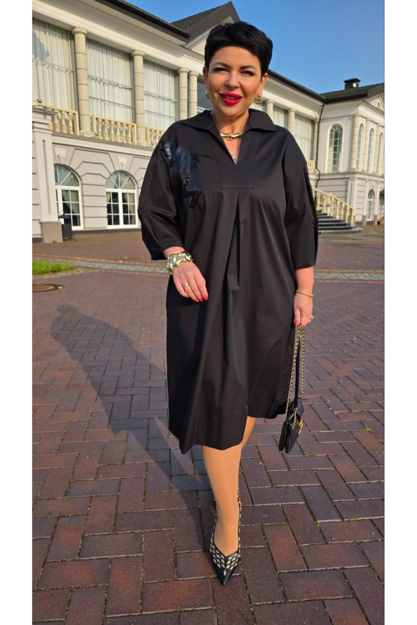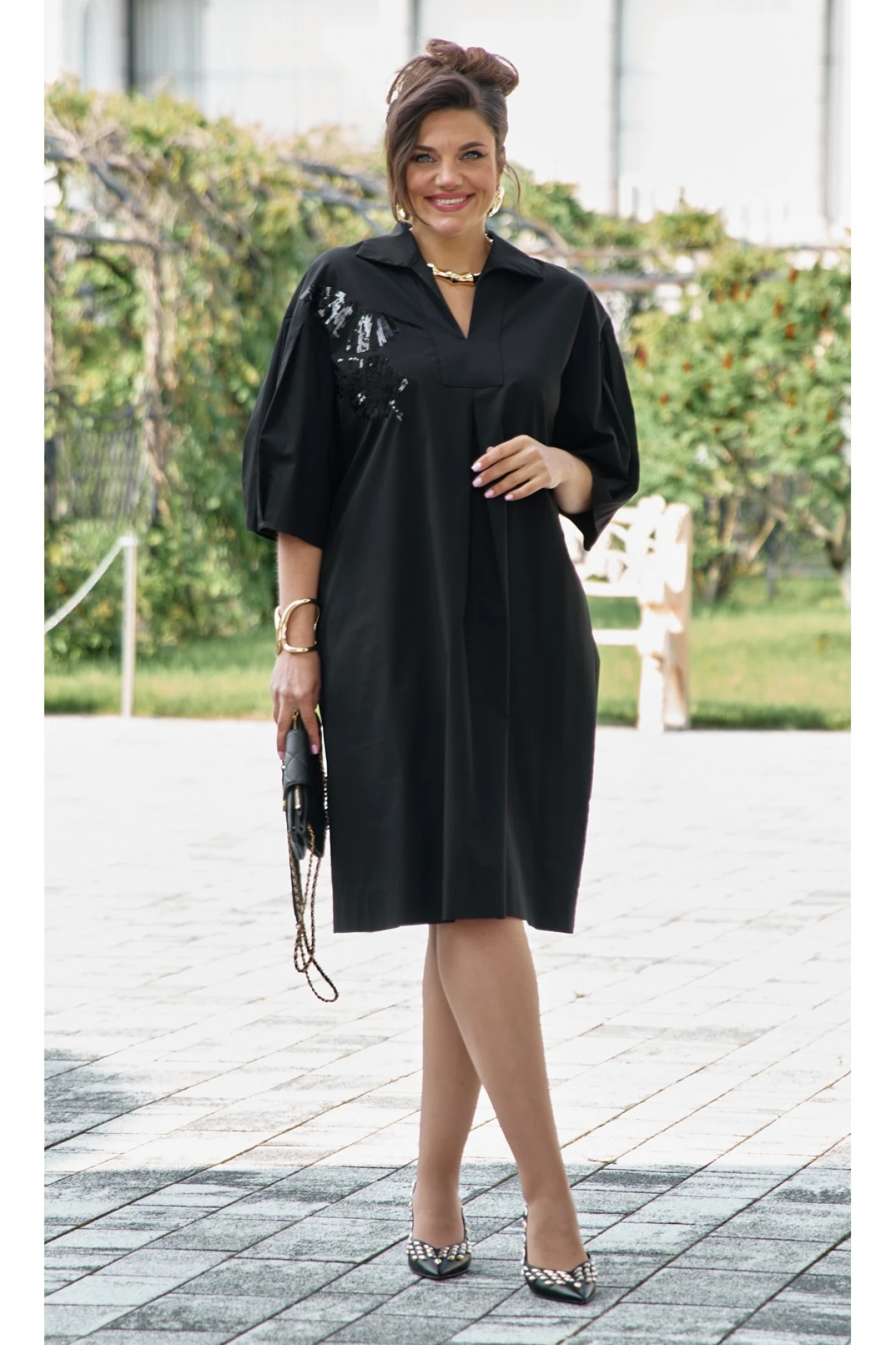 Невероятно красивое и элегантное платье - так коротко можно охарактеризовать данную модель! Очень лаконичное и стильное платье определённо привлечёт к себе внимание. Однотонное платье имеет лёгкий блеск, переливается на свету. Левую часть плеча и груди украшает изысканная вышивка в тон. Длина миди делает его универсальным для различных мероприятий, а отсутствие четко выраженной талии позволяет платью мягко облегать фигуру. Это платье — идеальный выбор для тех, кто ценит сочетание комфорта, элегантности и оригинальных деталей в повседневном и праздничном гардеробе. Платье А-силуэта, расширяется к низу, линия плеча спущенная. По переду платья вставка с плавным V- образным вырезом и широким отложным воротником. По переду платья застрачивается складка. По спинке платья притачная кокетка с застроченной складкой от подреза. Рукав втачной, в сгиб, с заложенными декоративными складками по окату и к низу. В боковых швах платья карманы. По низу платья широкая подгибка.