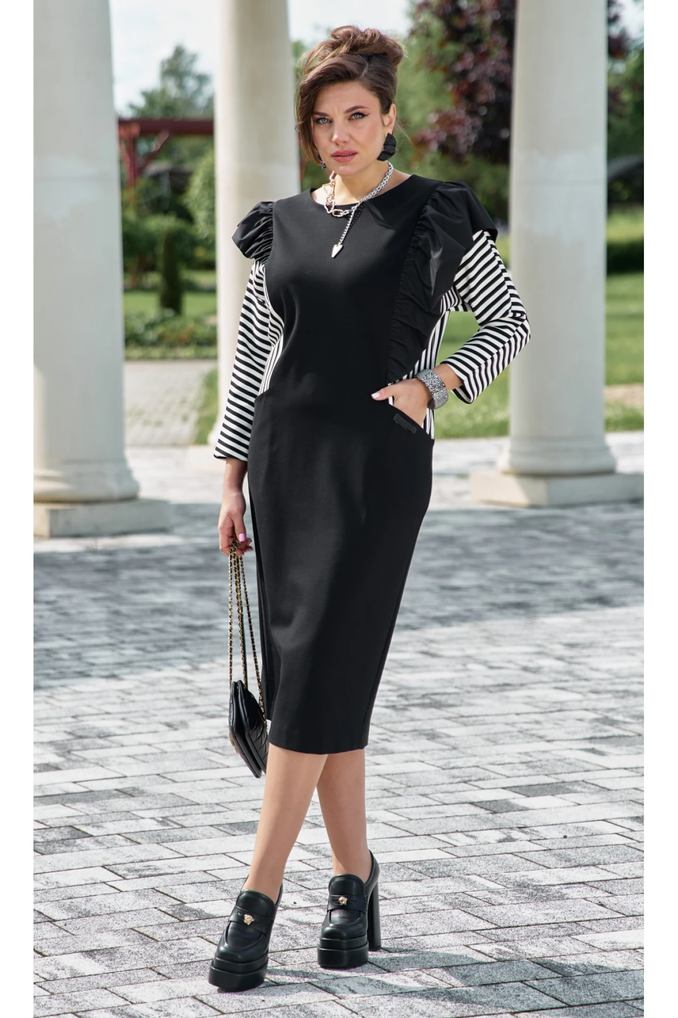 Платье женское из плотного чёрного трикотажа со вставками из отделочного материала — трикотажной полоски, визуально делает силуэта приталенным, а декоративные элементы в виде рюш по плечам добавляют образу игривости. Данная модель станет отличным вариантом для работы, прогулок, встреч в кафе. Платье свободного силуэта слегка заужается к низу, горловина с декоративным вырезом по форме «лодочка». По переду и спинке платья декоративные рельефы , переходящие в карман по переду. В качестве дополнительного декоративного элемента в рельефах платья — рюши из отделочной ткани, переходящие на спинку. По спинке платья вырез капелька с застёжкой на пуговицу, спинка в платье со средним швом заканчивающимся шлицей. По переду платья декоративный элемент в виде нашивки. Рукав цельнокроеный, длиной 7/8.