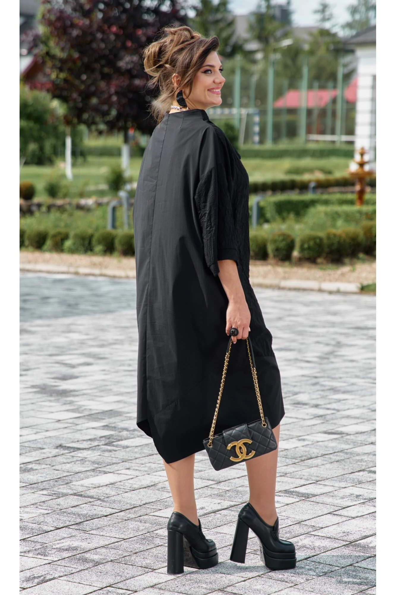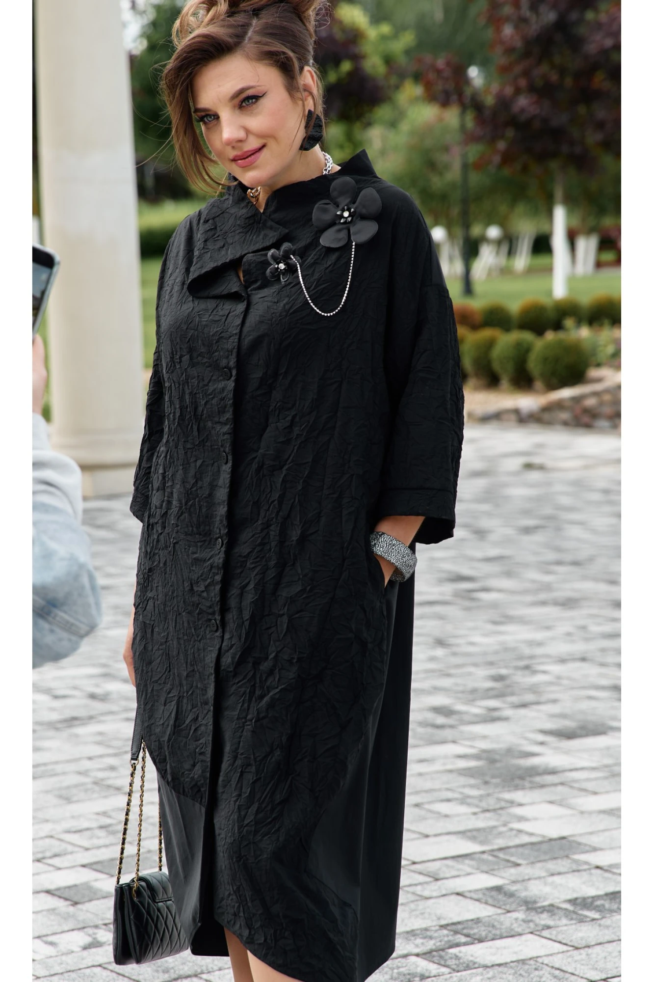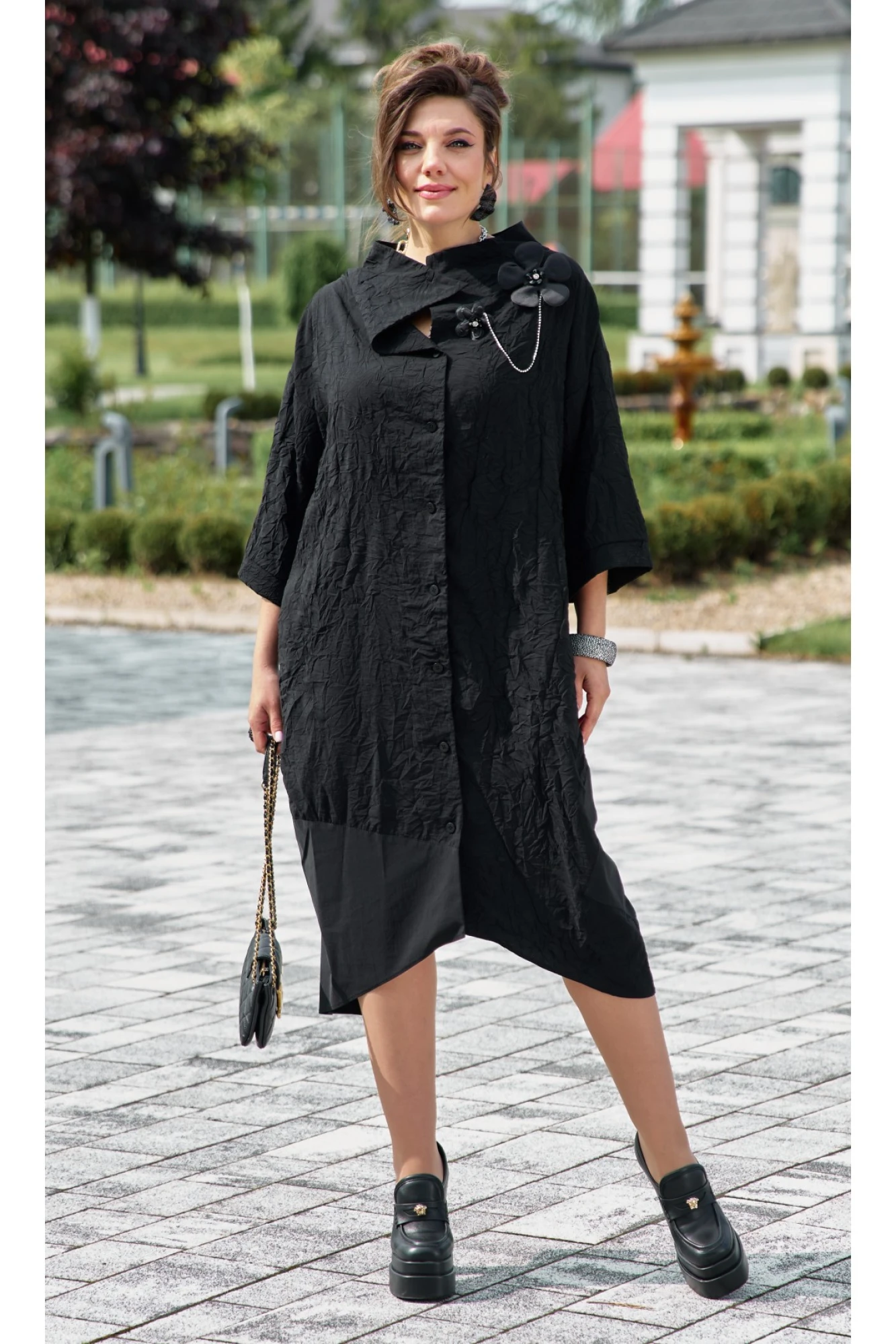 Представляем уникальное и выразительное платье, сочетающее в себе смелый дизайн и комфорт. Сочетание однотонного материала с тканью с эффектом «жатости», придает образу интересную текстуру и современный вид, оставаясь при этом невероятно практичным. Глубокий черный цвет подчеркивает элегантность и универсальность модели, позволяя легко комбинировать ее с различными аксессуарами. Свободный крой и длина обеспечивают максимальный комфорт и свободу движений, а также делают его подходящим для различных типов фигур. По переду платья центральная застёжка на петли-пуговицы по борту. Оригинальный высокий воротник, асимметричный, фиксируется при помощи застёжки на потайную кнопку. Линия плеча спущенная. Рукав втачной, длиной 7/8 с притачной манжетой по низу. В боковых швах платья карманы. По правой части переда платья подрез с притачной деталью из однотонной ткани переходящей на спинку платья. Спинка в платье со средним швом. Съемное декоративное украшение в виде стилизованного цветка с цепочками позволяет трансформировать образ, добавляя нотку изысканности или минимализма по желанию. Это платье идеально подходит для создания авангардных, но в то же время утонченных образов, подчеркивая индивидуальность и современный вкус. Обращаем Ваше внимание, что фурнитура может незначительно отличаться от фото.