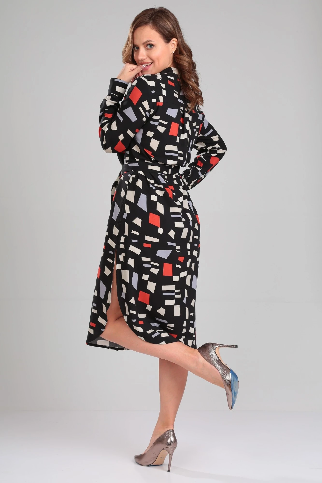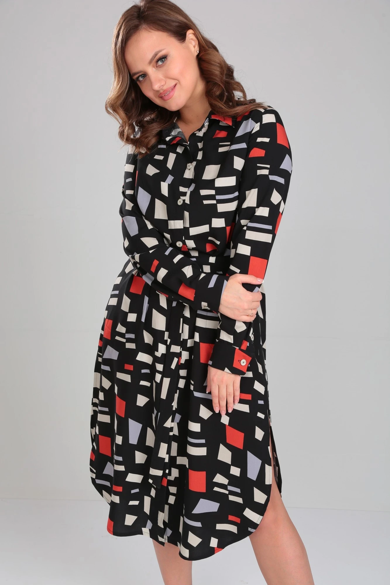 Платье-рубашка свободного силуэта. Застегивается на пуговицы. Воротник отложной на стойке. Рукав втачной на манжете и планкой по разрезу рукава. В боковых швах расположены карманы. Пояс из основной ткани с пряжкой. Низ оформлен фигурно, с разрезами в боковых швах.