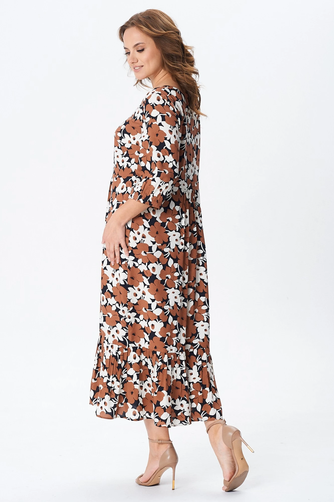 Стильное, комфортное платье свободного силуэта, отрезное чуть выше линии талии. Снизу волан, добавляющий изюминку образу. Рукав укороченный, по низу эластичная тесьма. Длина рукава 42 см. В верхней части платья застежка на пуговицы. В боковых швах расположены карманы. Длина изделия от плеча по спинке 130 см (для роста 164 см)/133 см ( для роста 170 см). Это платье станет отличным выбором для повседневной жизни или особого случая.