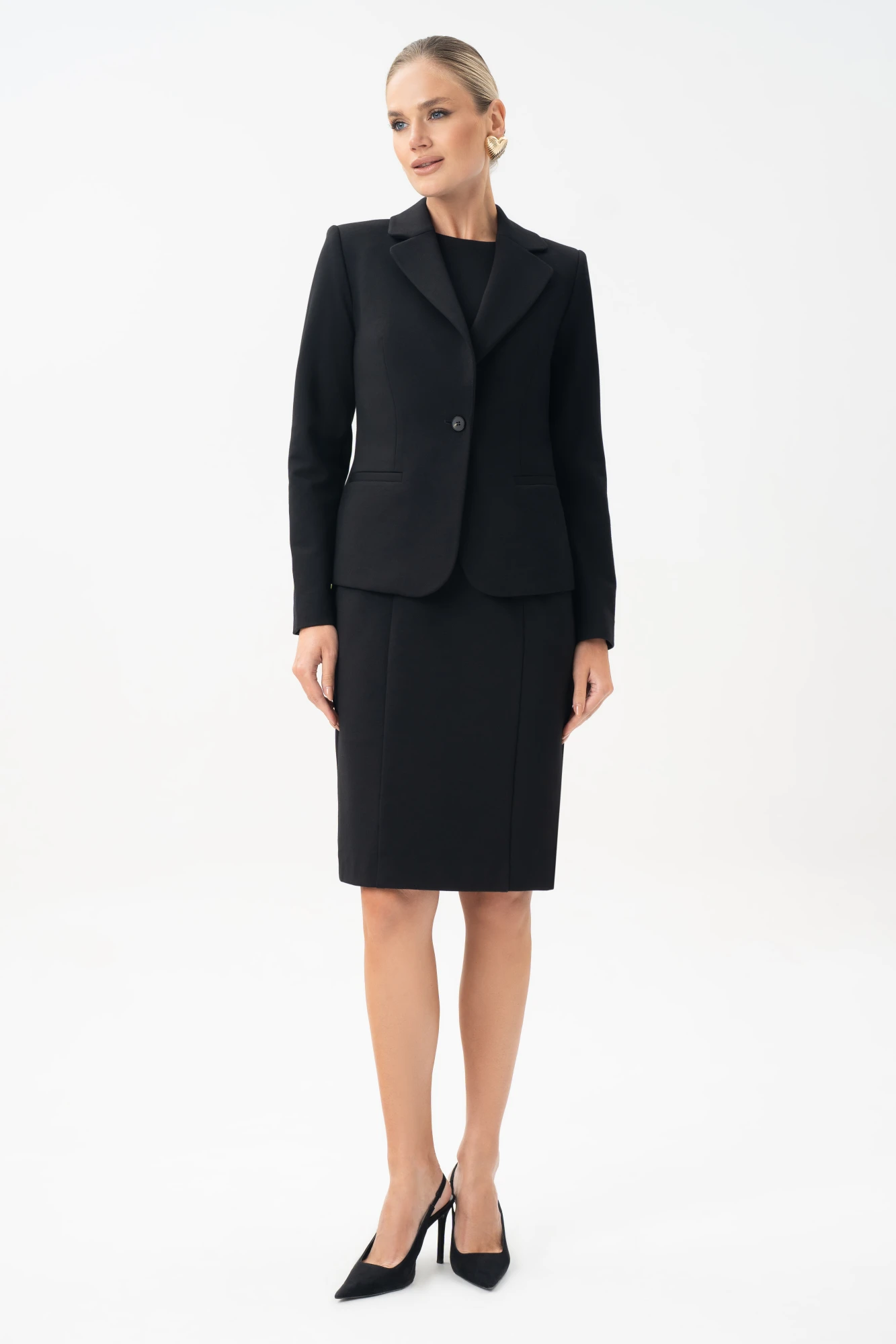 "Маленькое черное платье - это личный стиль и комфорт. Платье являются комплектом к жакету 25-641-1. Платье женское, полуприлегающего силуэта, отрезное по линии талии, без рукавов, выполнено из трикотажного полотна, предназначено для повседневной носки. Платье на отлетной по низу подкладке.
