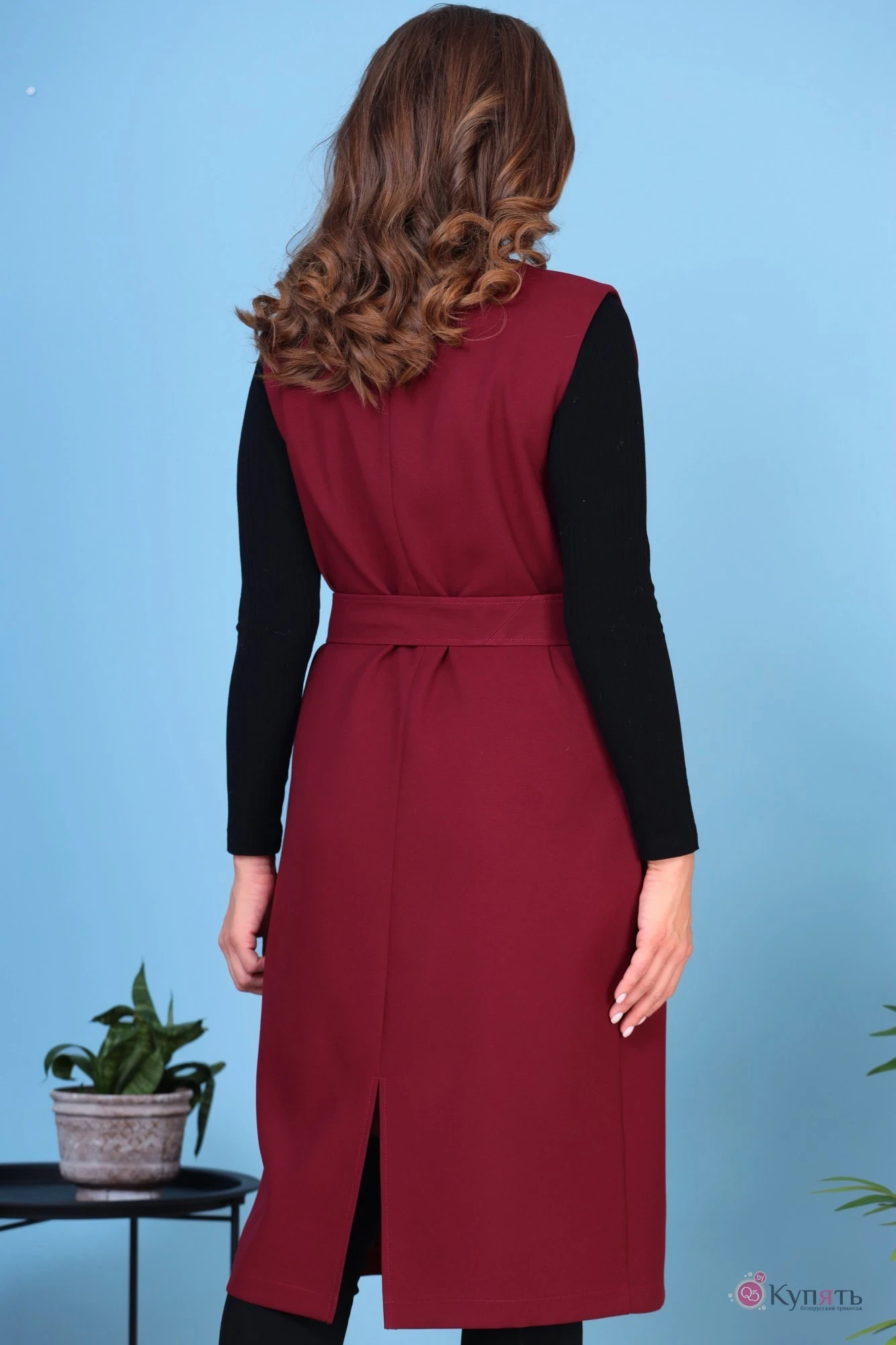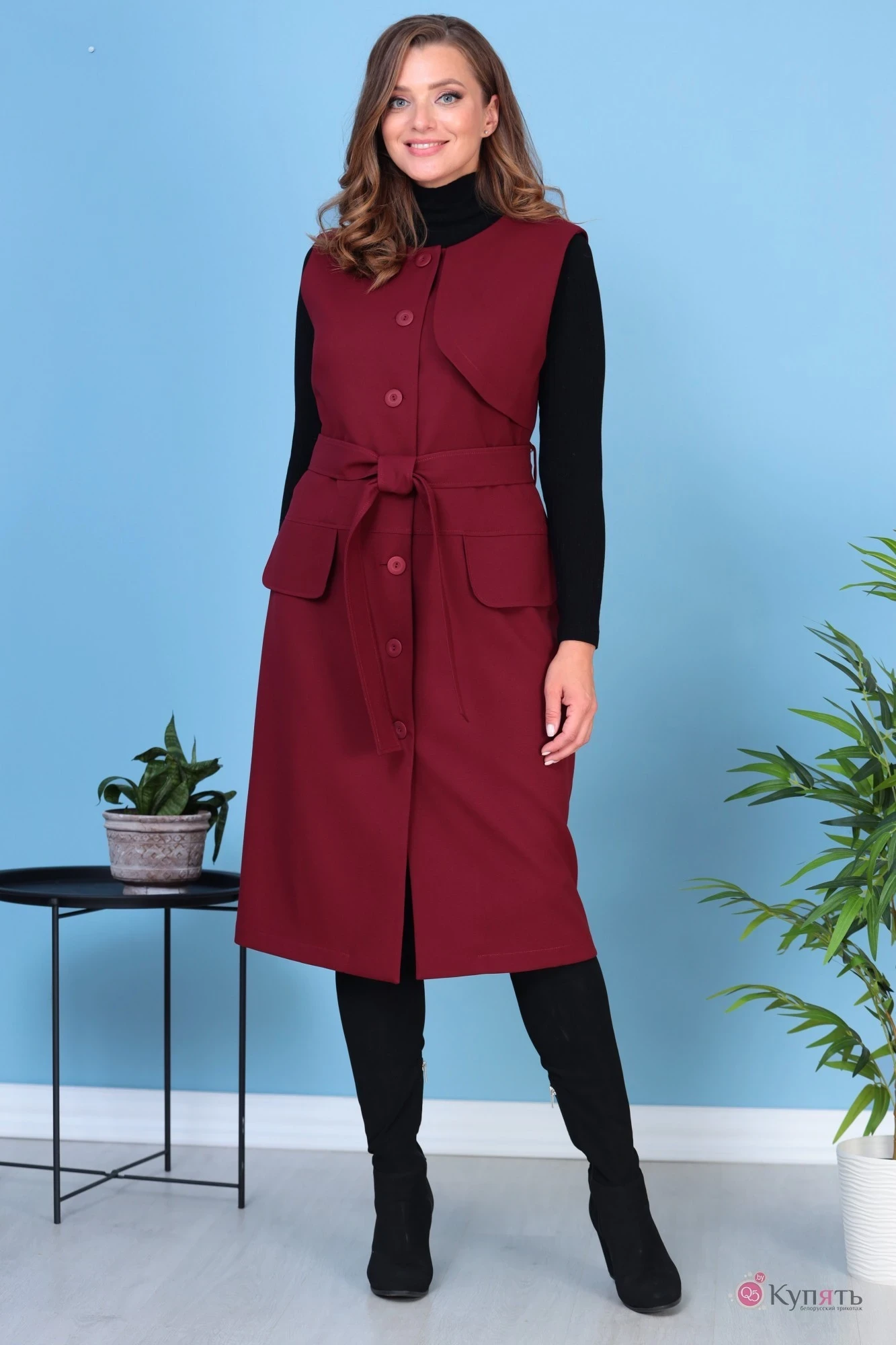 Сарафан выполнен из однотонной ткани. Сарафан прямого силуэта, длиной за колено. Полочка с нагрудными вытачками и центральной застежкой на петли и пуговицы. На левой полочке в верхней ее части, обработана отлетная кокетка. Ниже линии талии горизонтальный шов, в котором обработаны клапаны. По боковым швам в области талии настрочены шлевки, через которые продет пояс. Спинка со средним швом, в нижней части которого обработан разрез.