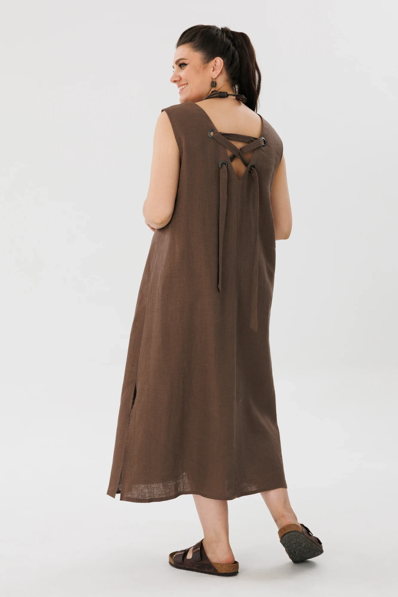 Сарафан силуэт трапеция. На спинке v вырез и люверсы, с игривыми завязками, которые подчеркивают женственность и изящество образа. Разрезы добавляют шарма образу, а также удобства.