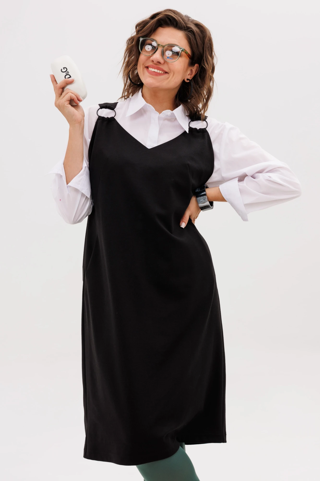 Практичность модели подчеркивают два аккуратных кармана. Особый шарм сарафану придают декоративные кольца на лифе, делая его современным и стильным. Универсальность модели позволяет легко комбинировать ее с рубашками, лонгсливами и другими базовыми вещами, создавая многогранный образ для любого дня.