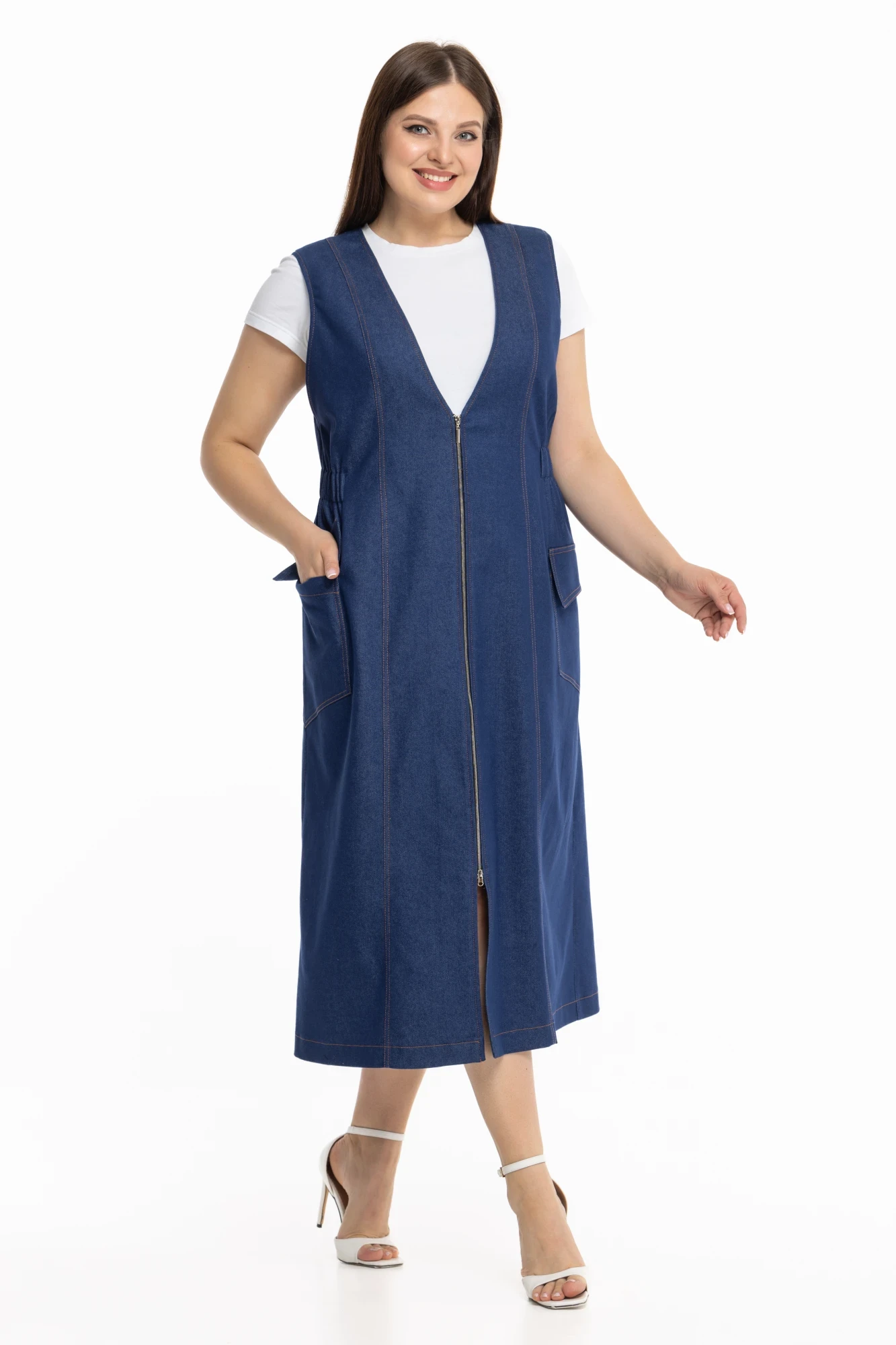 Сарафан приталенного силуэта хорошо вписывается в концепцию летнего гардероба. V-образный вырез в сочетании с застёжкой молнией и рельефами вытягивают фигуру, пояс с вставками из вшитых резинок подчеркивает талию. Наши мастера, создавая эту модель, не забыли и про комфорт. Удобные накладные карманы можно использовать для мелочей. Сарафан - лёгкий и верный способ произвести впечатление как в офисной среде, так и в менее формальной обстановке.