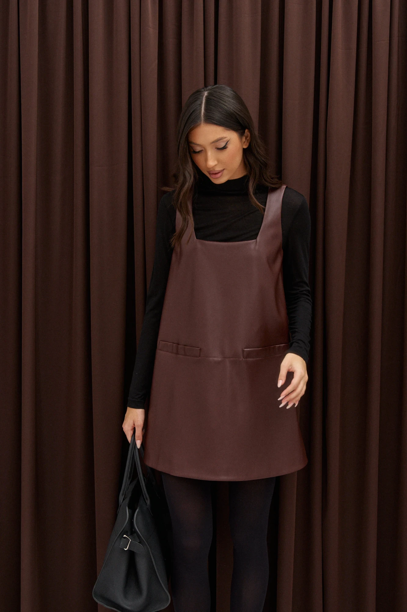 Платье-мини из эко-кожи. А-образный силуэт. Вырез горловины квадратный. Подрез ниже линии талии. В подрезе ли́сточки (нефункциональные). Есть подклад. Длина спинки платья 79 см
