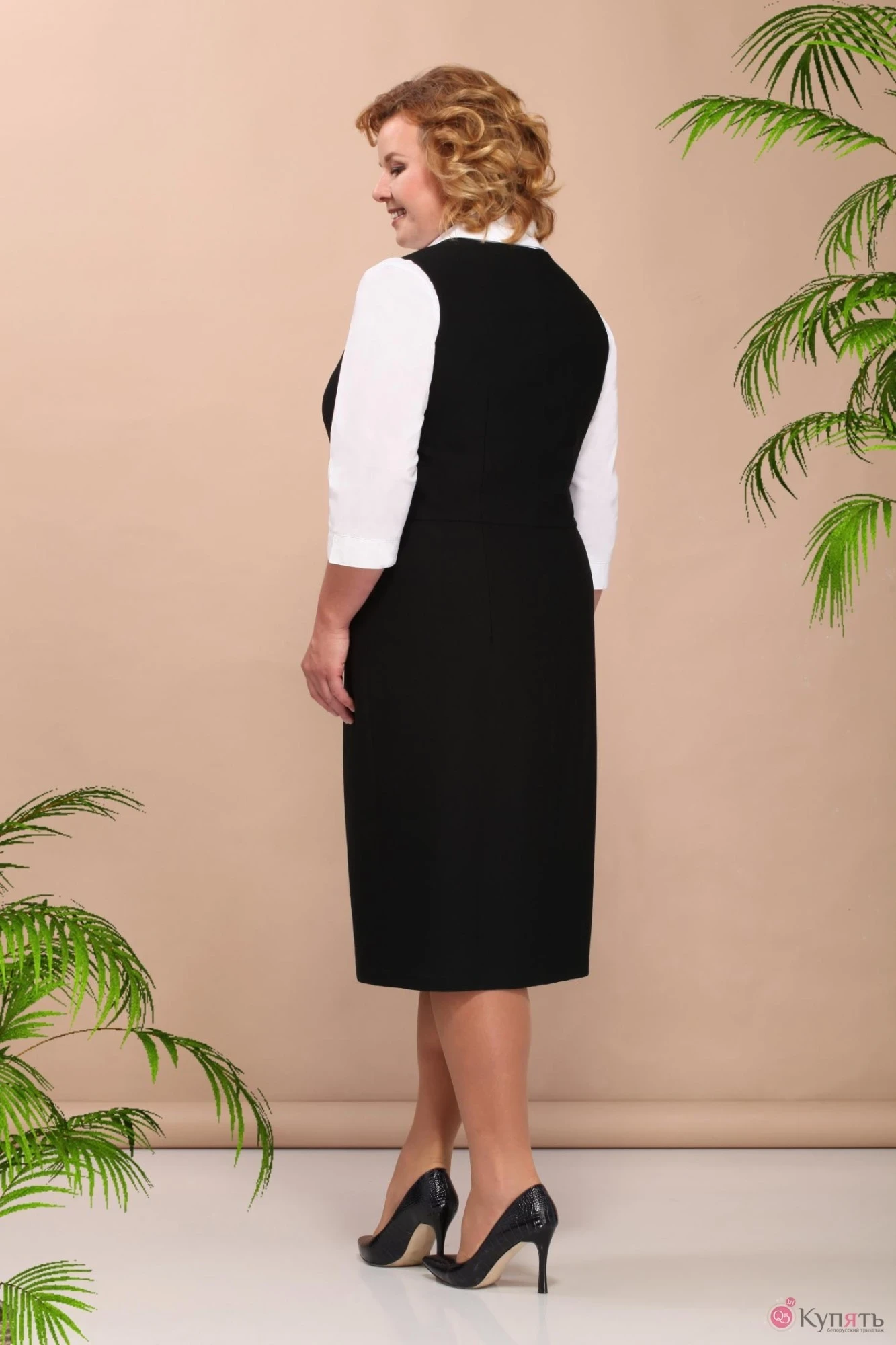 Элегантный женский комплект состоит из сарафана и блузки. Сарафан полуприлегающего силуэта, отрезной по линии талии, по переду центральная застежка на молнию, на уровне бедер накладные карманы с клапаном. Горловина образная. Спинка с центральным швом и талиевыми вытачками. Сарафан на подкладке. Блуза полуприлегающего силуэта с центральной застежкой на петли – пуговицы, по переду отрезные кокетки, на уровне талии по боковой части переда отделочные защипы, воротник рубашечного типа. Рукава втачные со сборкой по окату. Низ рукава оформлен манжетом.