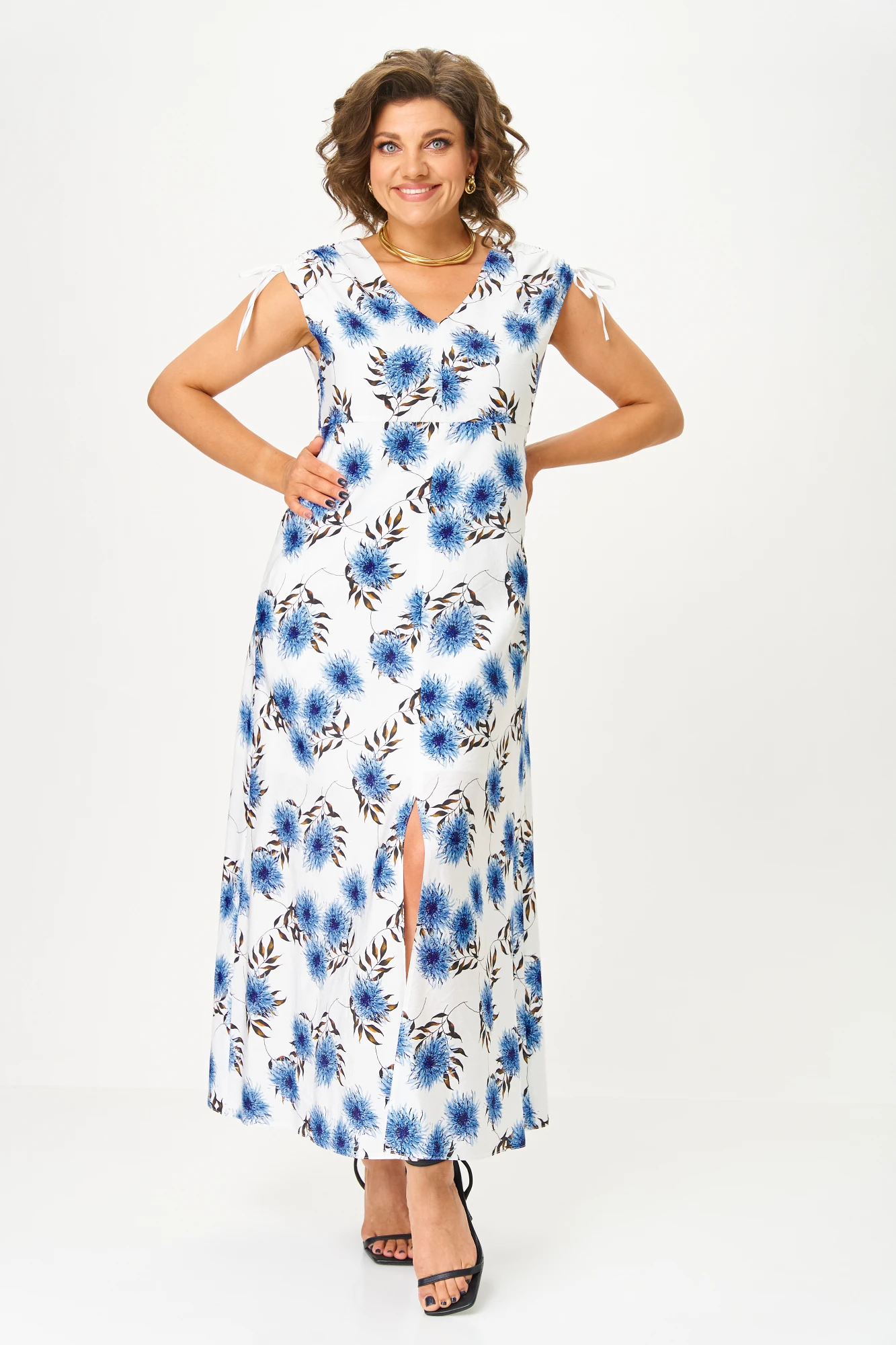 Сарафан полуприлегающего силуэта, расширенный к низу, отрезной под грудью. Горловина V образная, линия плеча спущенная с кулисами для сборки.