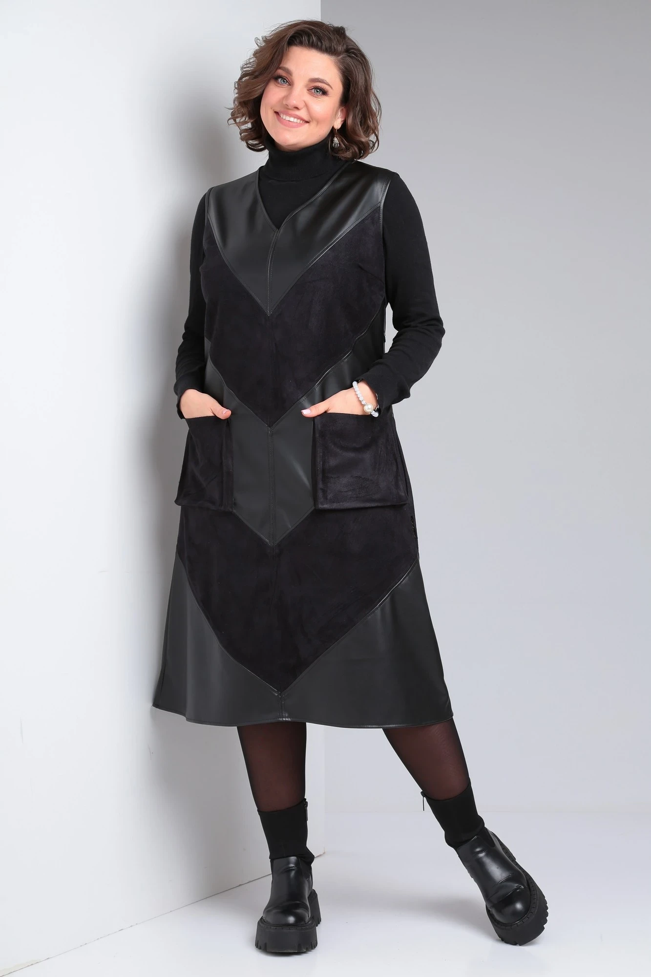 Оригинальный комбинированный сарафан из качественной экокожи и искусственного замша от Celentano полуприлегающего силуэта.