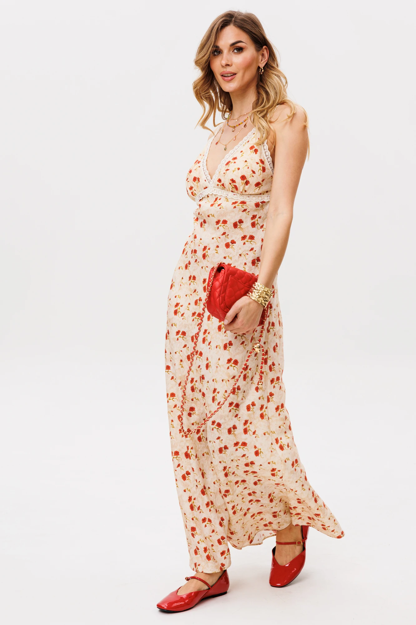 Сарафан выполнен из плательно-блузочной ткани с цветочным принтом. Сарафан полуприлегающего силуэта, длиной до линии щиколотки. Перед и спинка покроены по косой. Спереди фигурные подрезы под грудью. Горловина V-образной формы. Сарафан декорирован тесьмой-кружевом, переходящим в бретели. Лиф двойной.