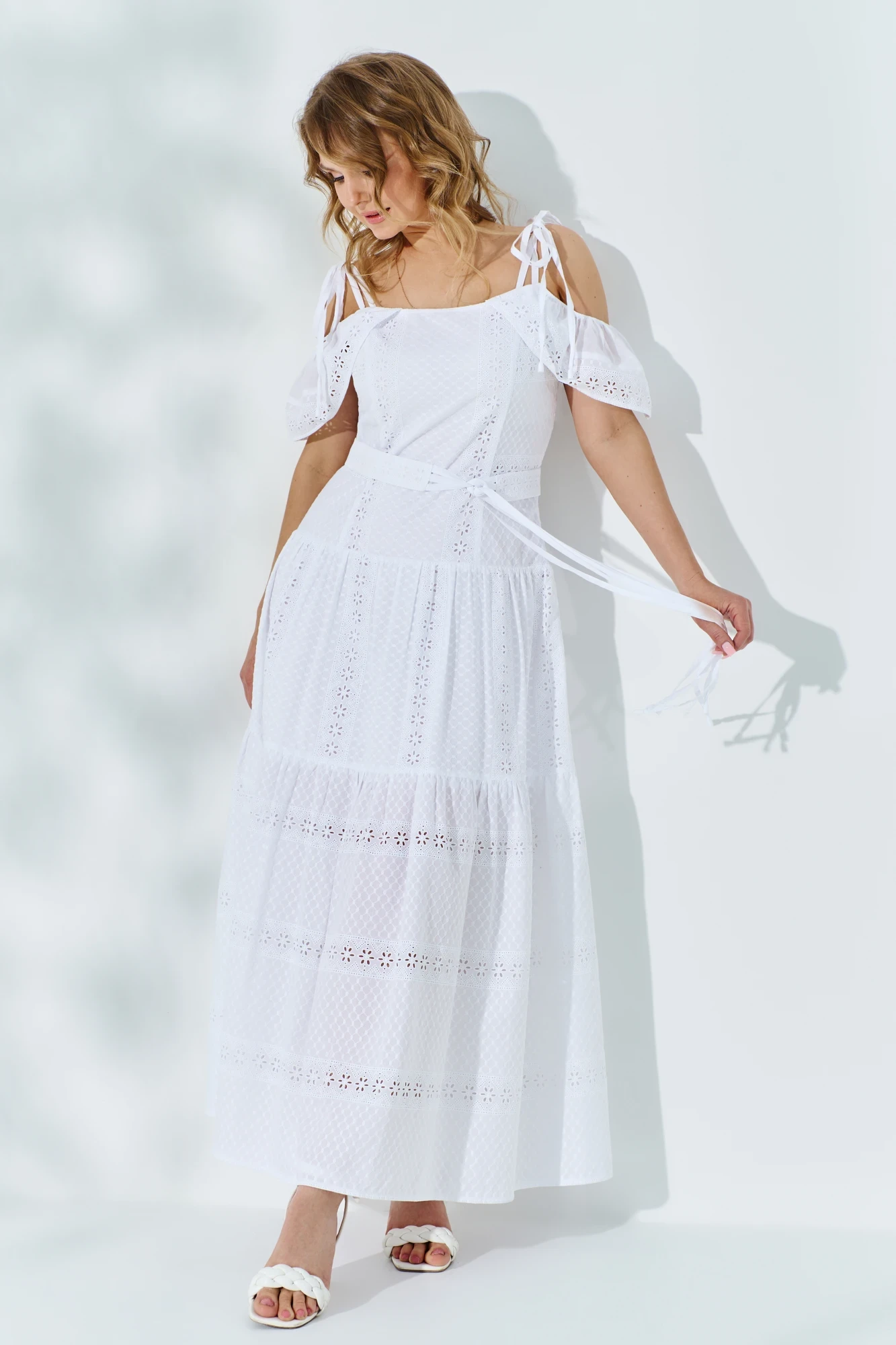 Сарафан женский полуприлегающего силуэта со спущенным рукавом- и завязками. По полочке и спинке изделия- рельефы. Сарафан с воланами ярусами и шитьем по ткани. Пояс входит в комплектацию, хлопок 100%