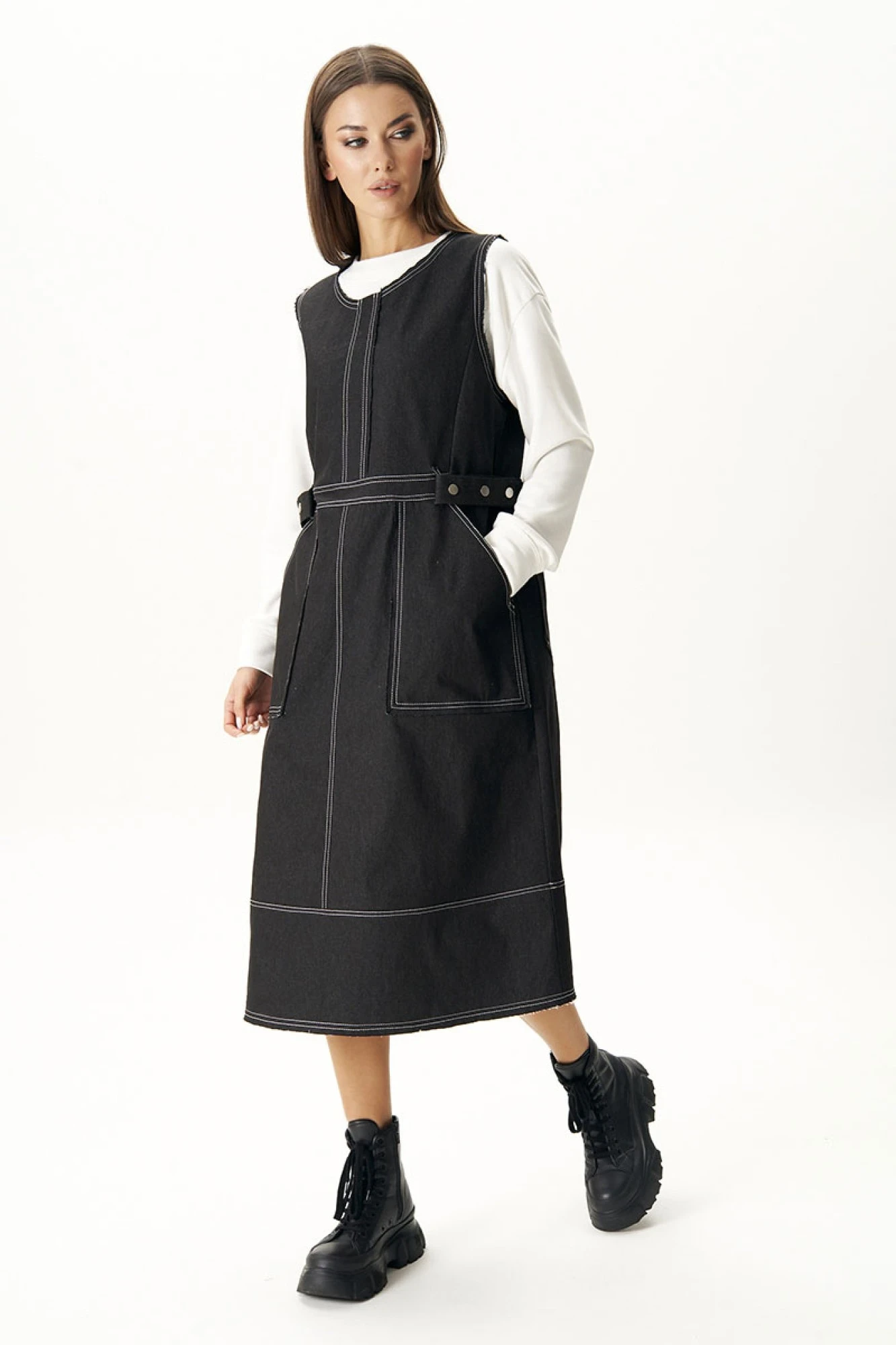 Свободный А-силуэт, средняя длина, круглый вырез и застёжка-молния по спинке. Полочка с боковыми рельефами, подрезом в центральной части по линии талии, накладными фигурными карманами и планкой, имитацией застёжки. Спинка с боковыми рельефами, подрезами в центральной части по линии талии, застёжкой-молнией и накладными карманами.