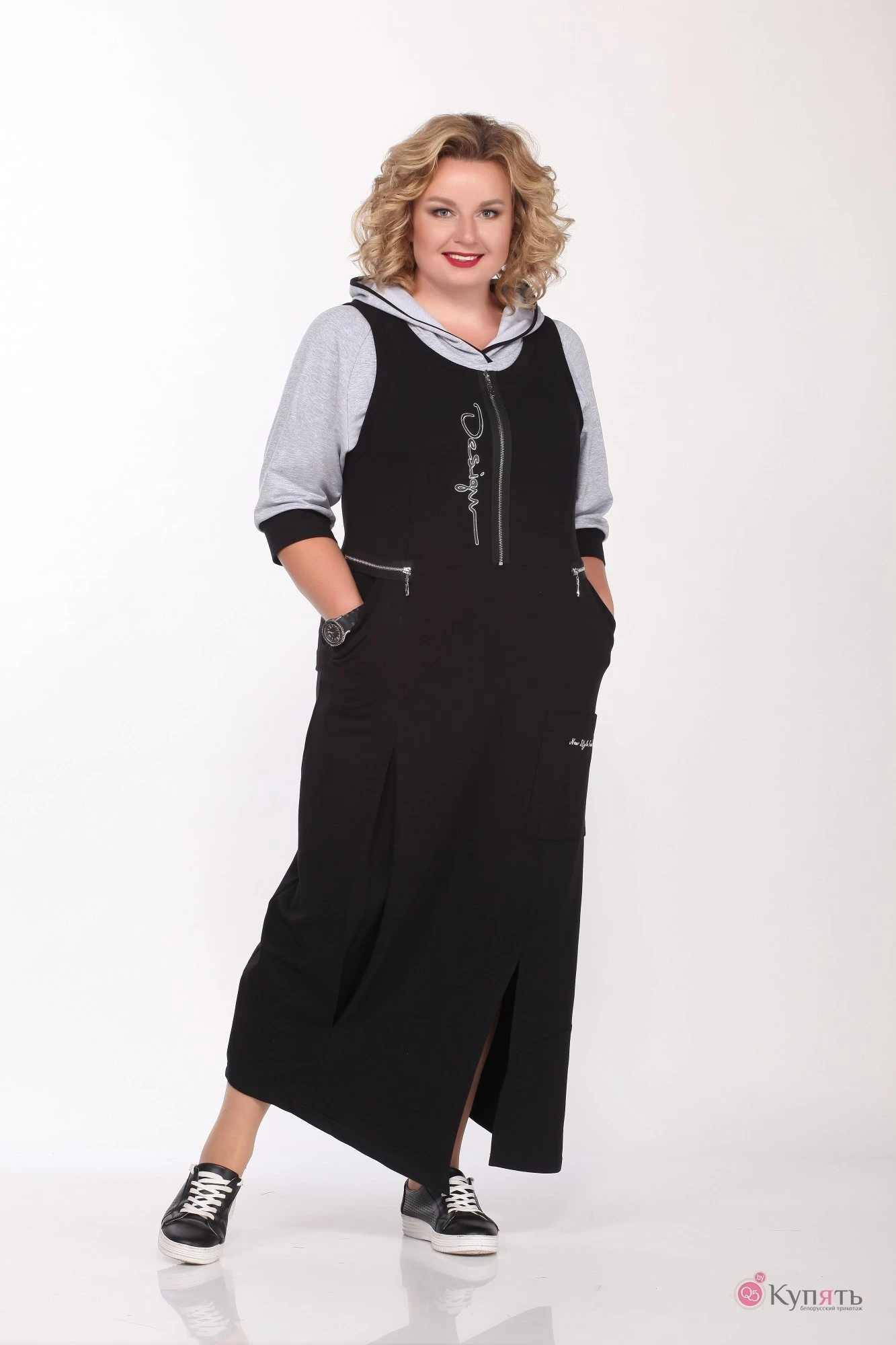 Комплект двойка из трикотажного полотна. Сарафан в стиле “Бохо”, с множеством актуальных топ - элементов (декоративные молнии, фигурные подрезы, ассиметричный низ, и ассиметричные защипы- складка). Джемпер с капюшоном на округлой горловине и контрастной отделкой – кант. Рукав реглан ¾ в боковых швах разрезы.