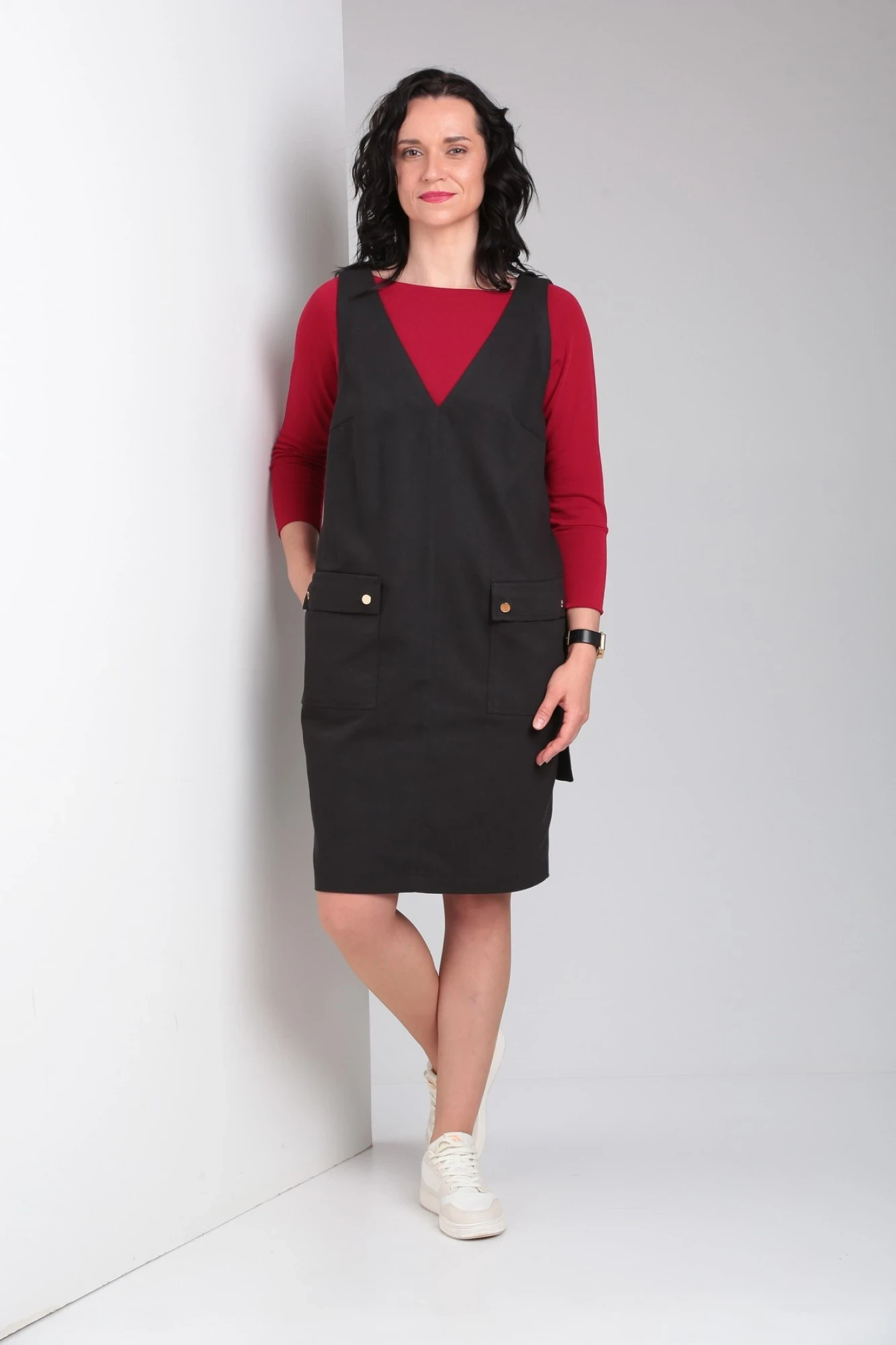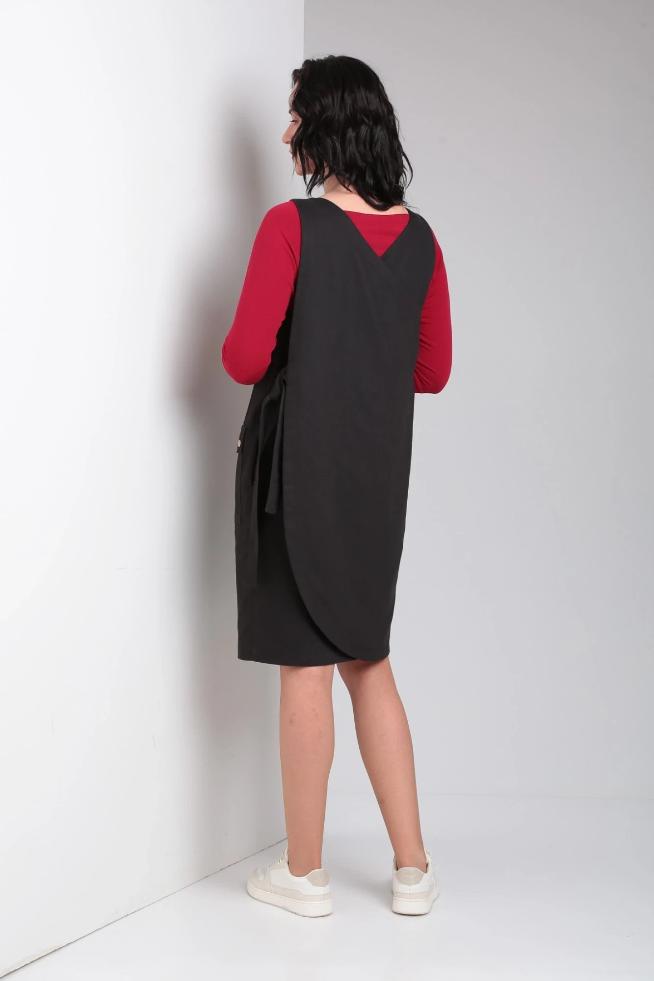 Сарафан из джинсовой ткани прямиго силуэта с запахом на спие и V-образным вырезом горловины по переду. По переду расположены накладные карманы с клапанами. И в боковых швах также обработаны карманы. Длина по переду от плечевого шва 98см..