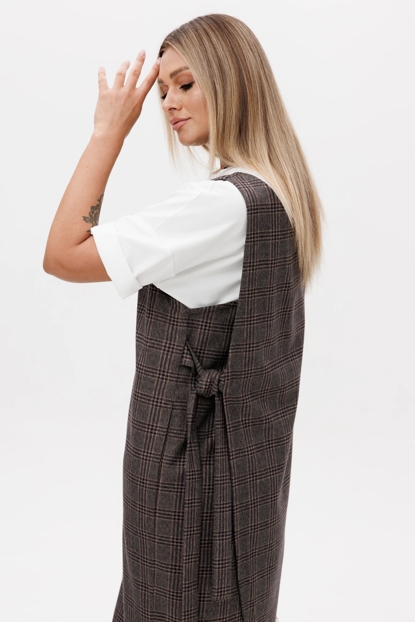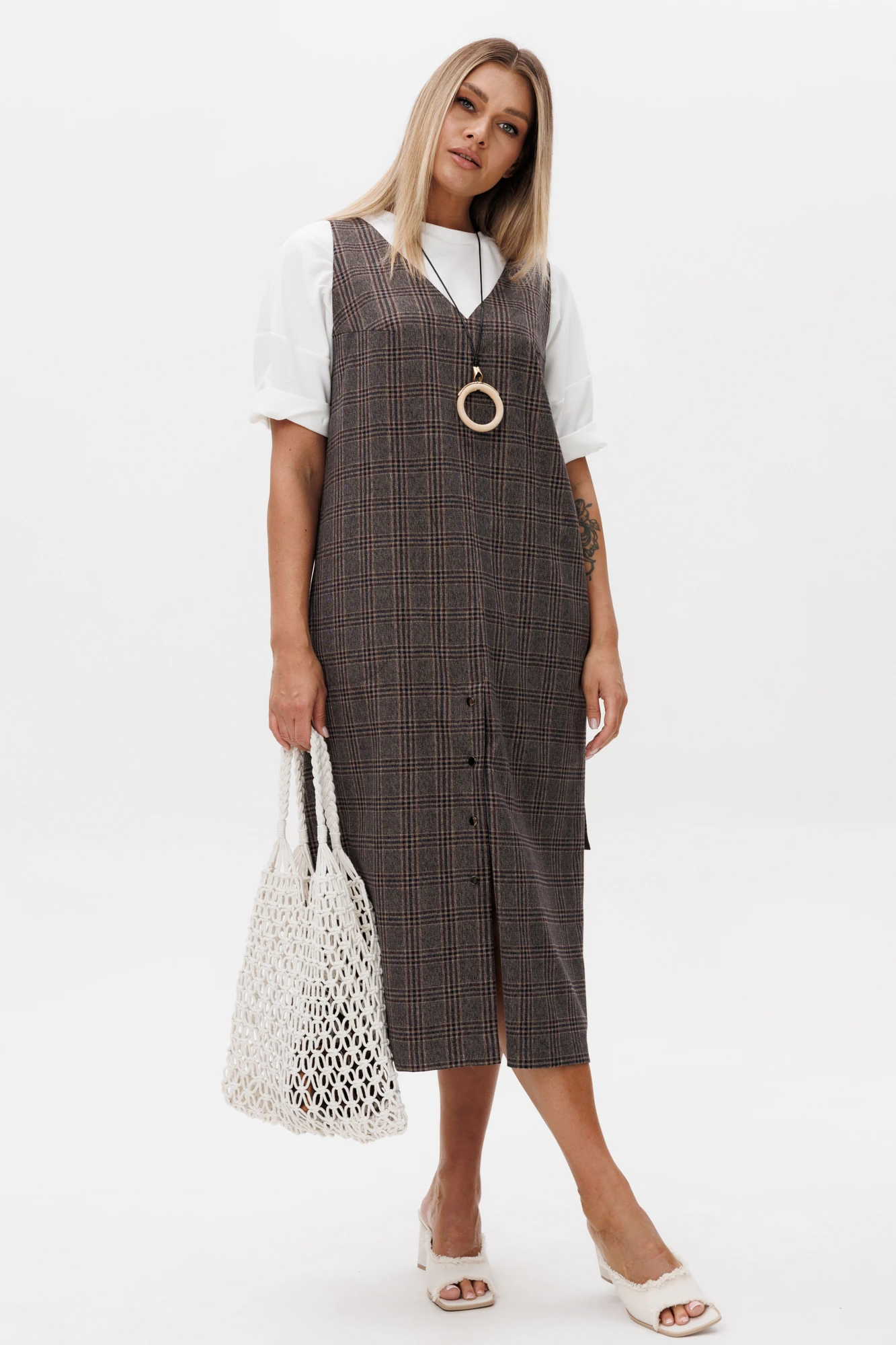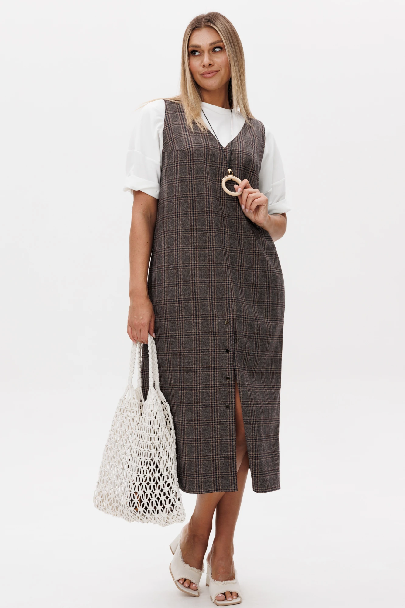 Сарафан прямого силуэта с V-образным вырезом и с запахом на спине. В боковых швах есть карманы.. По переду шлица на кнопках.