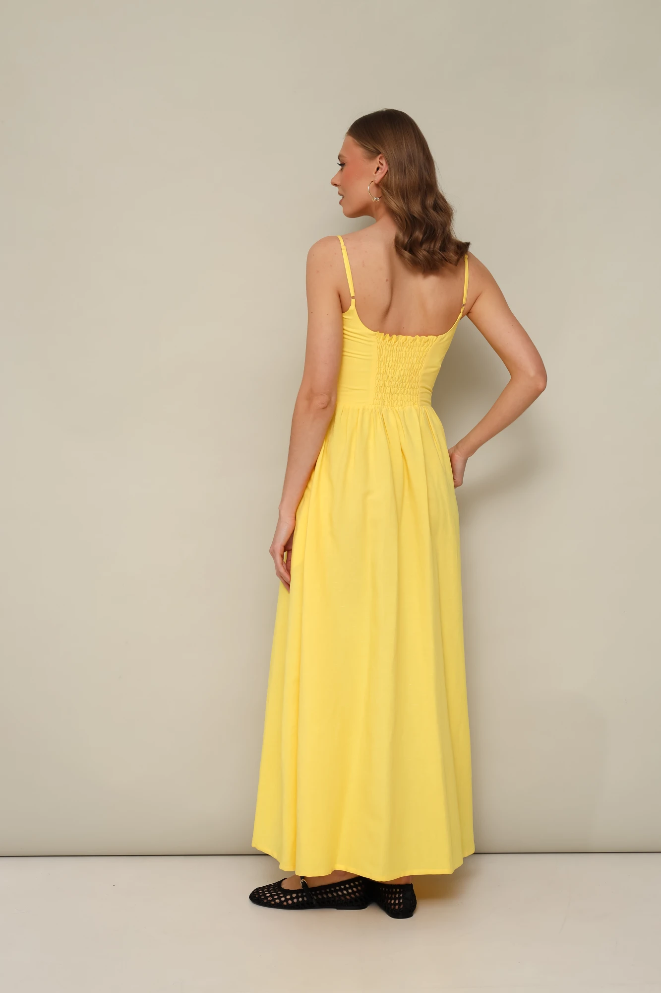 Платье отрезное по линии талии, на бретельках с регуляторами, выполнено из натурального льна. Лиф прилегающего силуэта, с фигурным вырезом в области линии талии. Застежка на потайную молнию в боковом шве. Спинка частично обработана венгеркой, для комфортной регуляции размера. Юбка А-образного силуэта, с внутренними карманами в боковых швах.